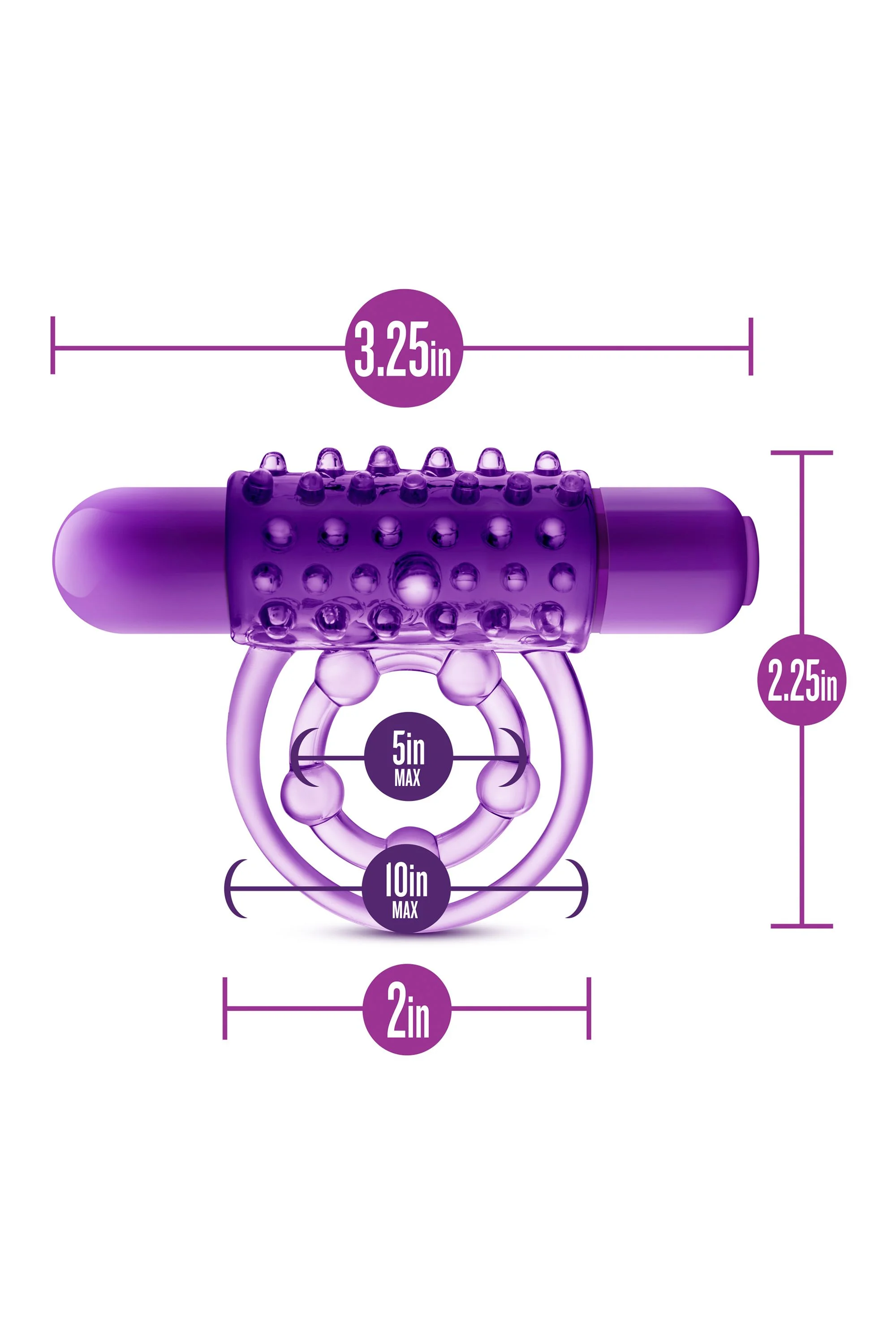 Met een lengte van 68 mm en een maximale diameter van 50 mm biedt deze cockring een perfecte aansluitende en flexibele pasvorm. De ring bevat een krachtige bullet die met één druk op de knop intense, diepe pulserende vibraties afgeeft. Deze vibraties zorgen voor een stimulerende sensatie die bij elke beweging versterkt wordt door de zachte textuur met fijne stimulatienoppen. Bovendien heb je de vrijheid om te kiezen of je de cockring met of zonder de bullet gebruikt, of zelfs alleen de bullet, waardoor deze cockring zeer veelzijdig is in gebruik.