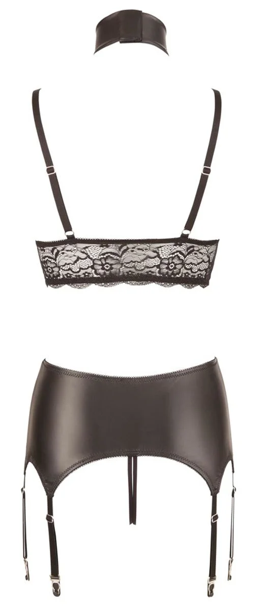 - Complete lingerie set met BH, jarretelgordel, string en halsband met handboeien
