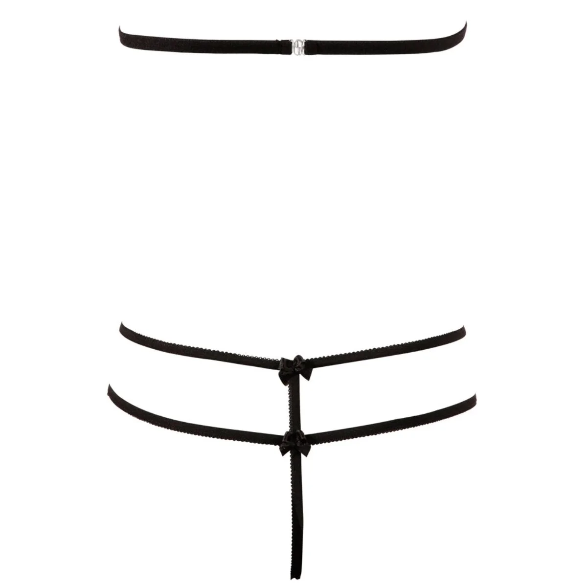 De string valt direct op door zijn gedurfde ontwerp met twee dunne banden die de heupen elegant markeren. Het open kruis voegt een pikante en intrigerende touch toe, waardoor deze set bij uitstek geschikt is voor speciale momenten. Dankzij het zwarte kant is deze lingerie zowel sexy als romantisch, een perfecte keuze voor vrouwen die houden van klassieke verleiding met een moderne twist. Deze lingerie set is ideaal voor talloze gelegenheden en kan een extra boost van zelfvertrouwen geven tijdens intieme avonden.