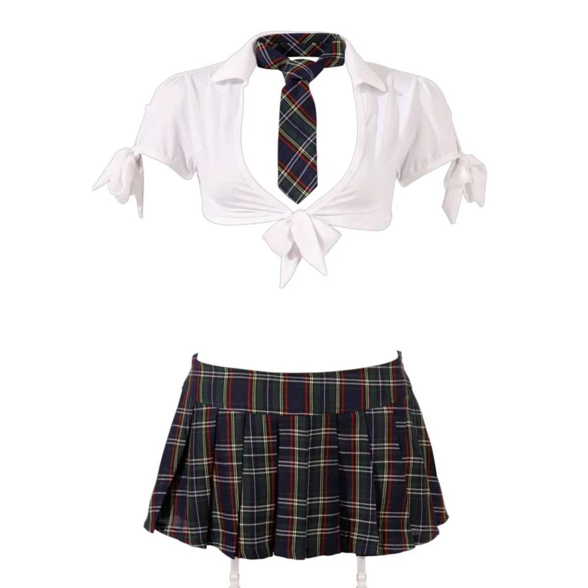 Stap in een wereld van fantasie en verleiding met het Cottelli Collection - Schoolmeisjes Uniform, een sensationeel lingerie set ontworpen voor spannende rollenspellen. Dit gewaagde uniform is het perfecte geschenk om te geven of te krijgen en maakt het mogelijk om je stoutste wensen als sexy schoolmeisje waar te maken. Het delicate topje met korte mouwen kan aan de voorkant worden gestrikt, waardoor je het precies kunt afstemmen op jouw lichaamsvorm. De bijpassende stropdas, in dezelfde kleur als het rokje, zorgt voor een speelse maar verleidelijke bedekking van decolleté, en accentueert je vrouwelijke lijnen.