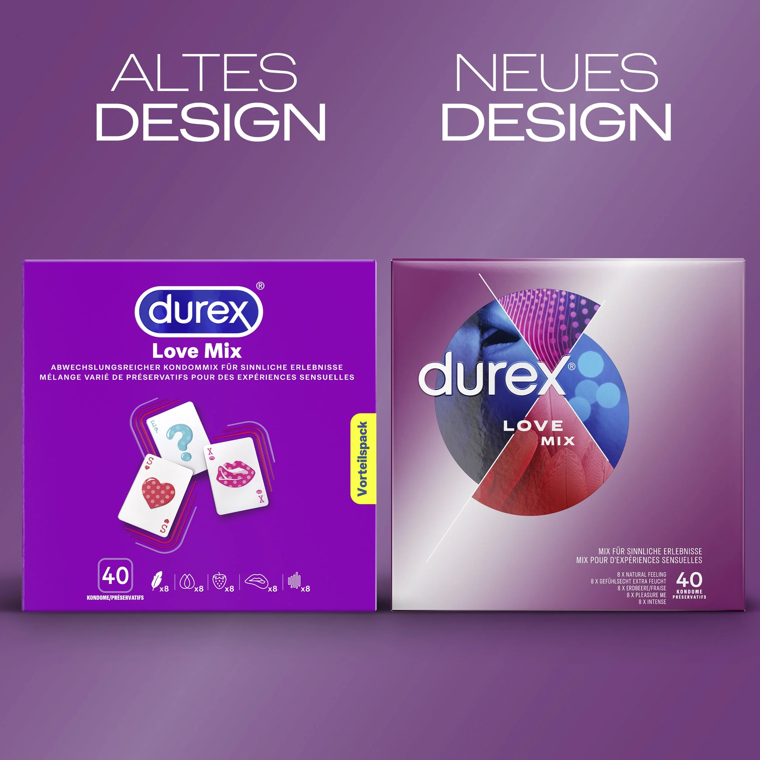 Deze voordeelverpakking Love Mix bevat 40 Durex-condooms van de vertrouwde beste kwaliteit, verdeeld over 5 spannende varianten: