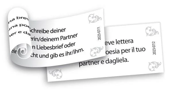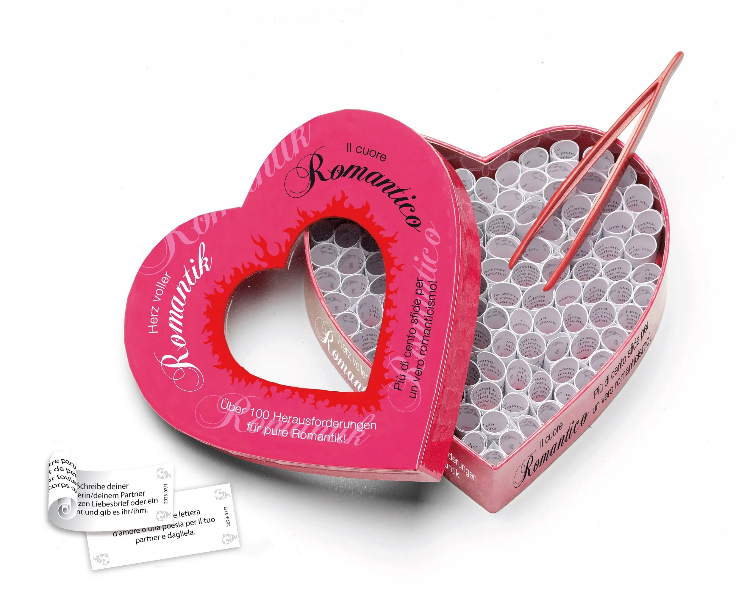 Het Hart vol Romantiek is perfect afgestemd op alle soorten koppels, ongeacht gender of seksuele voorkeur. De kleine papierrollen met opdrachten zitten verpakt in een elegant hartvormig doosje met afmetingen van 14,5 x 14,5 x 5 cm en zijn beschikbaar in het Duits en Italiaans. Dit maakt het een uniek cadeau voor romantische momenten, bijvoorbeeld voor anniversaries, bijzondere feestdagen of gewoon om samen quality time door te brengen. Laat Tease & Please jullie liefde inspireren en creëer samen talloze mooie herinneringen.