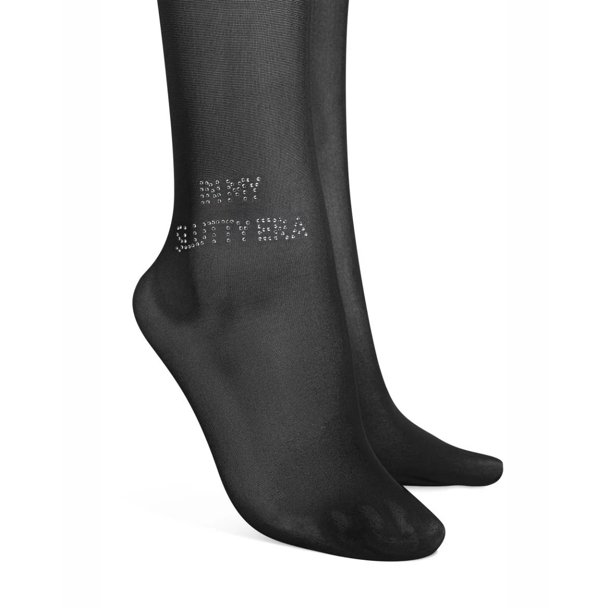 Een echte eyecatcher is de glanzende belettering 'IN MY SLUTTY ERA' boven de enkel, die de panty een modern en uniek karakter geeft. Dit detail zorgt voor een opvallend contrast met de subtiele transparantie en het strakke ontwerp, waardoor deze panty zich onderscheidt als een fashion statement binnen de categorie beenmode en kousen. Deze panty wordt met zorg geproduceerd in de EU, waardoor kwaliteit en aandacht voor detail gegarandeerd zijn. Handwas is aanbevolen om de bijzondere materialen en het prachtige design zo lang mogelijk te behouden.
