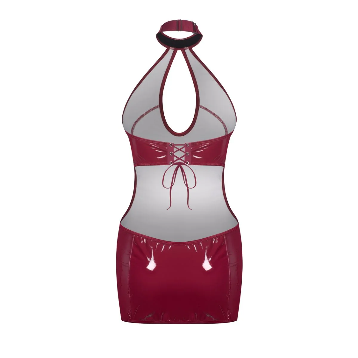 Gemaakt van een zorgvuldig samengestelde mix van 100% polyurethaan, 95% polyester en 5% elastaan, sluit de Redya Jurk comfortabel aan op je lichaam. De soepele, glanzende stof volgt moeiteloos je lichaamscontouren en biedt tegelijkertijd voldoende rek om je vrij te kunnen bewegen. Een diep uitgesneden halslijn met een verfijnd cut-out detail benadrukt je decolleté op elegante wijze, terwijl de verstelbare rugvetersluiting zorgt voor een perfecte pasvorm die je silhouette prachtig accentueert. Dankzij de geïntegreerde, verstelbare choker krijgt deze erotische jurk een extra spannende en unieke touch.
