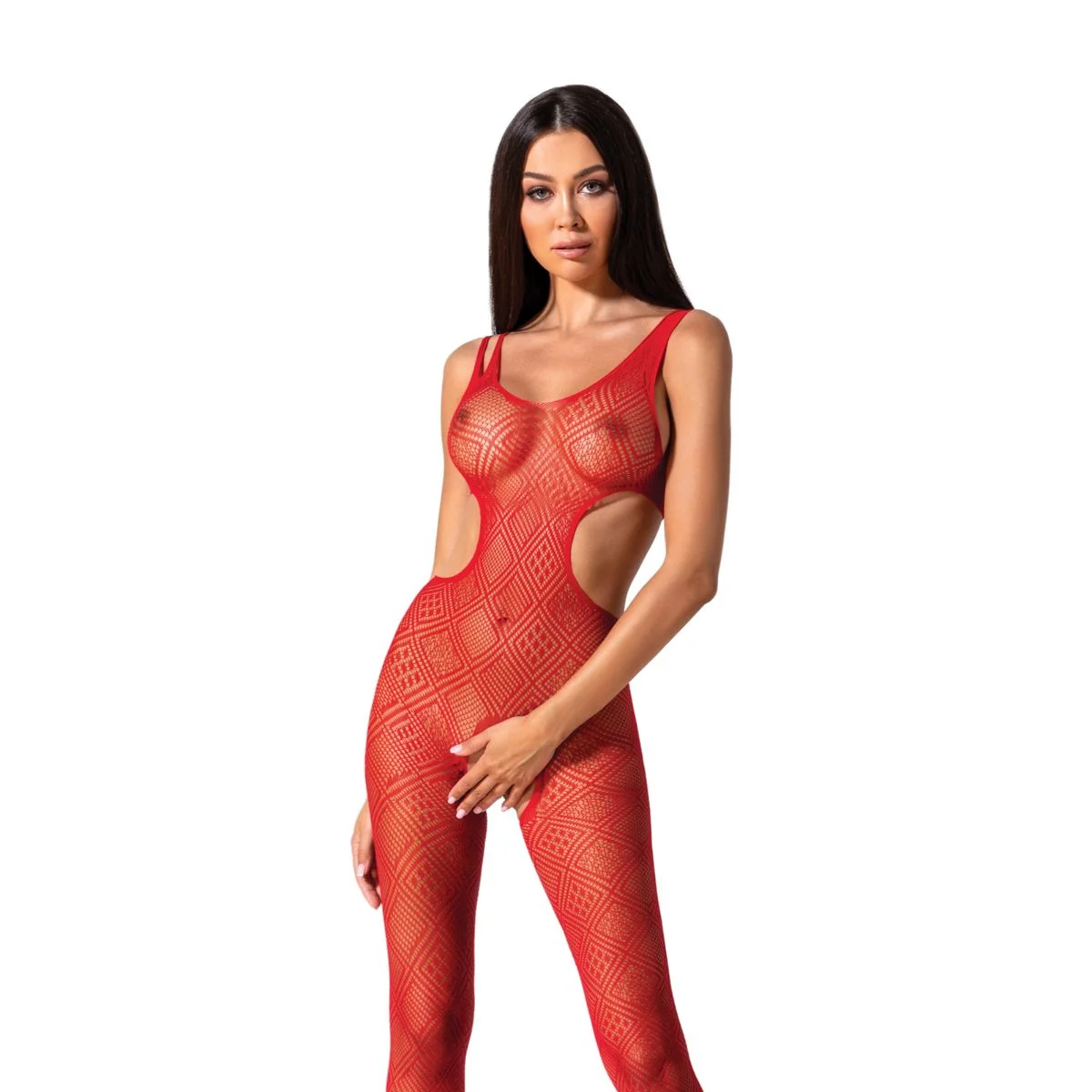 Ontdek de verleidelijke charme van de Passion - BS085 Catsuit in fel rood, een stijlvolle en gewaagde lingerie voor dames die hun vrouwelijkheid willen benadrukken. Deze nauwsluitende catsuit is ontworpen met een opvallend geometrisch patroon dat samen met de open tailleaccenten je natuurlijke silhouet prachtig omlijnt. Het lijnenspel volgt je vormen op een elegante manier, waardoor je een slanke en moderne uitstraling krijgt die zowel speels als sensueel is. De combinatie van bedekking en transparante elementen zorgt voor een spannend effect, waardoor deze catsuit een onweerstaanbare blikvanger wordt.