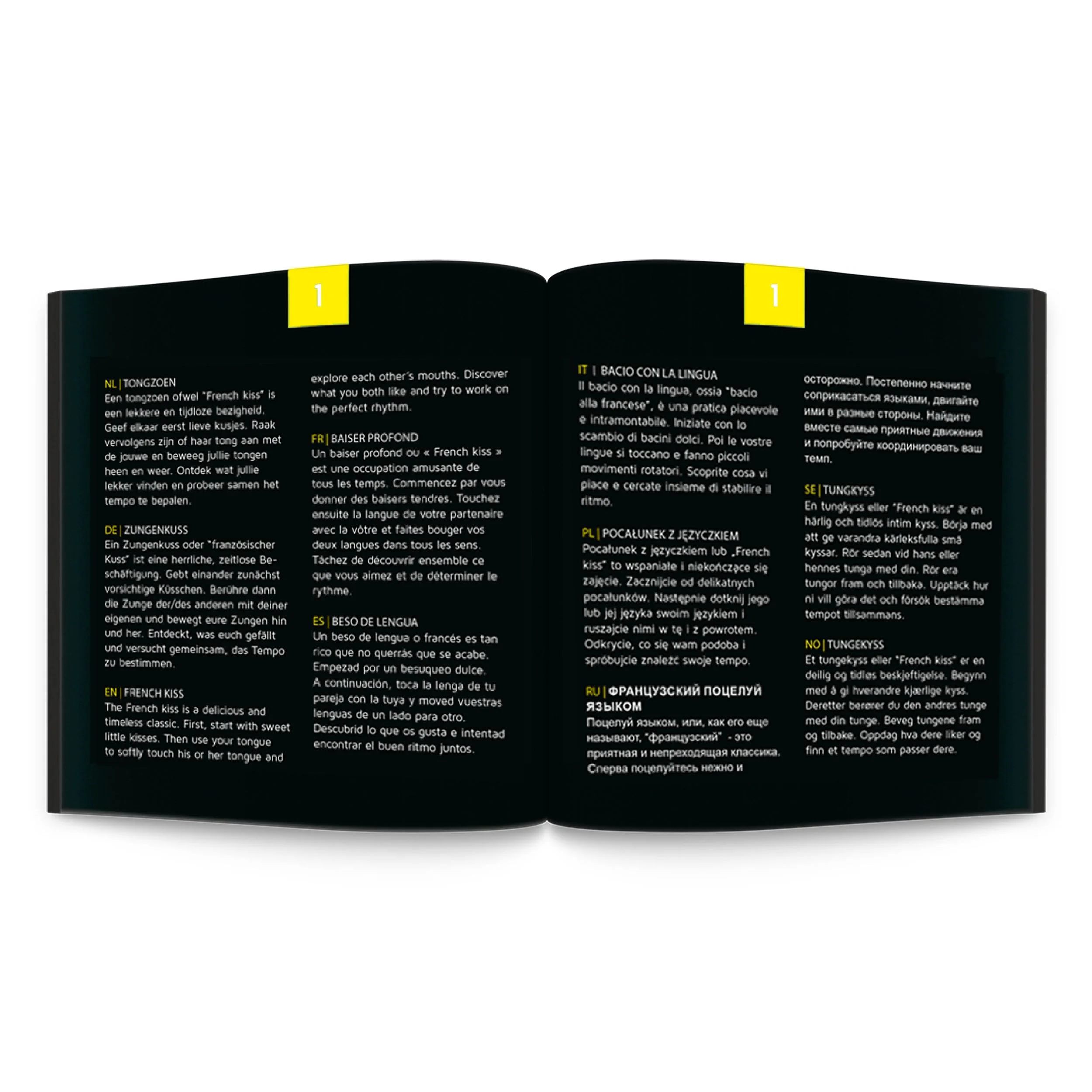 Sex Roulette Kiss beschikt over een veelzijdige Kiss-editie die beschikbaar is in maar liefst 10 talen, waaronder Nederlands, Engels, Duits, Spaans en Italiaans. Hierdoor is het spel niet alleen toegankelijk, maar ook perfect geschikt voor koppels die graag samen iets nieuws willen ontdekken of voor stelletjes die hun bestaande routines willen doorbreken. De 24 uitdagingen zorgen telkens voor een andere ervaring en nodigen uit tot experimenteren met verschillende vormen en intensiteiten van zoenen, waardoor ongemerkt steeds meer plezier en genot ontstaat tijdens het spel.
