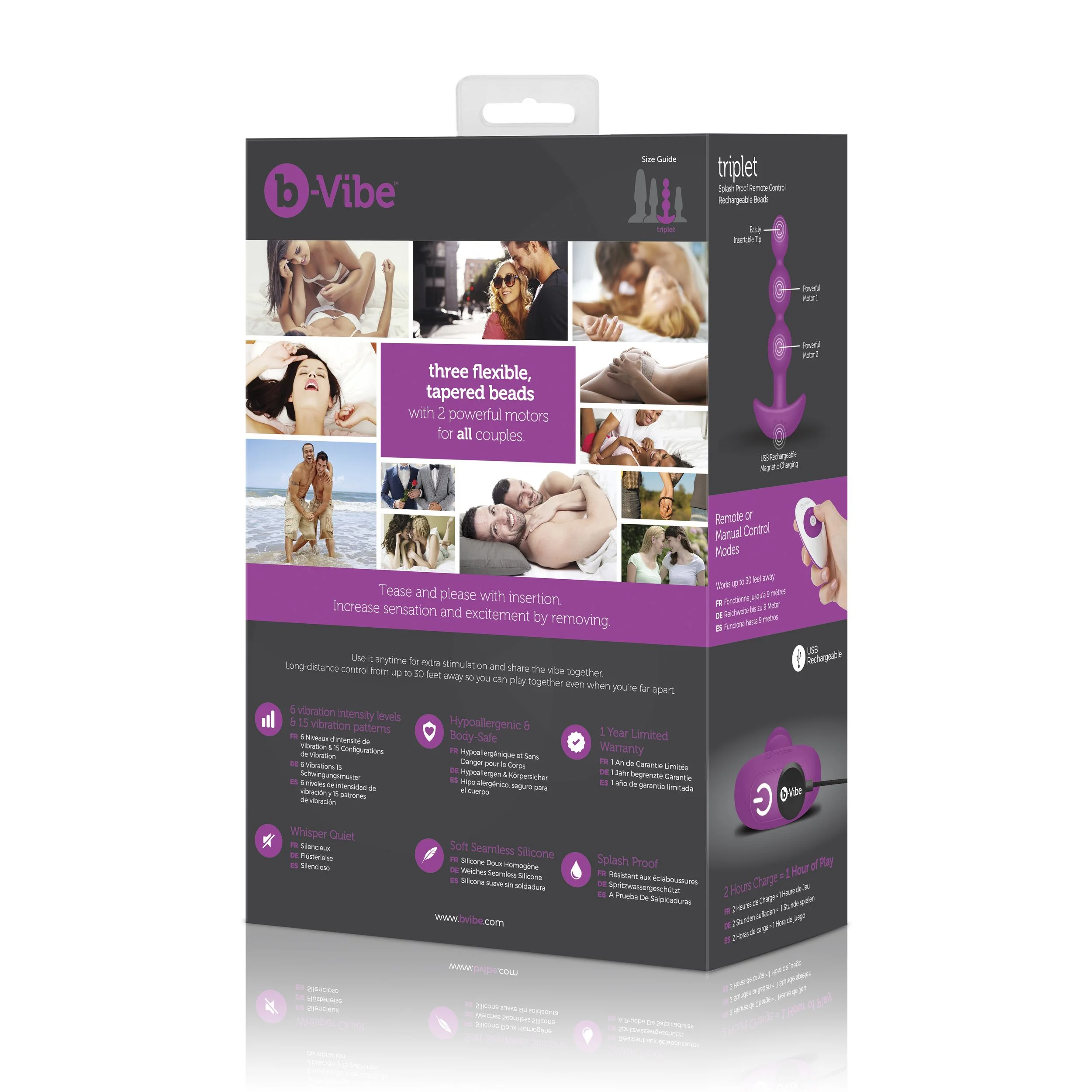 Drie taps toelopende kralen geven deze vibrator direct een rustige opbouw. De B-Vibe - Triplet Anale Kralen Fuchsia begint slank en bouwt geleidelijk op naar meer vulling, waardoor je stap voor stap kunt verkennen wat bij je past. Dat maakt dit model sterk voor starters die graag controle houden, maar ook voor gebruikers die al ervaring hebben en meer variatie zoeken. De twee motoren geven de vibe extra dynamiek, terwijl het ergonomische handvat de beweging stabiel houdt tijdens solo spel of samen. Je wisselt eenvoudig tussen 6 vibratiestanden en 15 patronen, zonder dat het gebruik druk of onrustig aanvoelt.