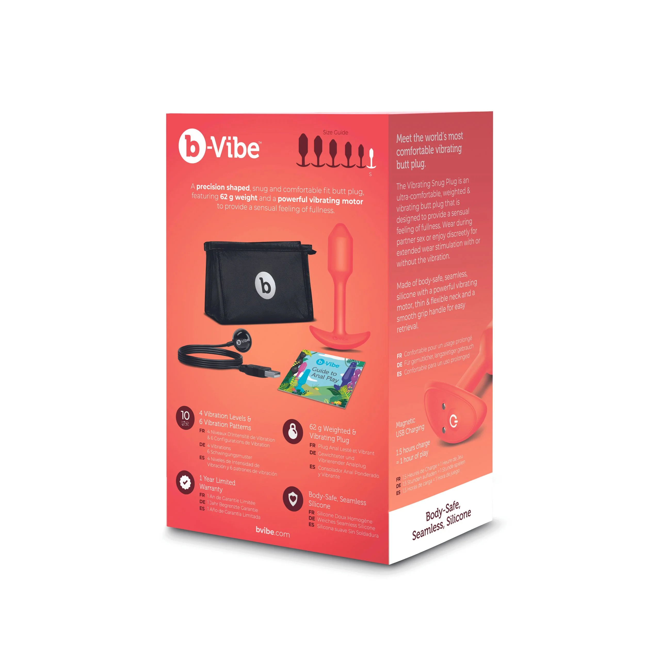De B-Vibe Vibrerende Snug Plug wordt compleet geleverd met een handig opbergzakje, zodat je hem discreet kunt bewaren of mee kunt nemen. Daarnaast ontvang je een uitgebreide anale speelgids, ideaal voor wie op een veilige en plezierige manier nieuwe avonturen wil beleven. Deze compacte vibrator werkt zowel op usb-oplaadkabel als batterijen, waardoor je altijd flexibel bent in het opladen en gebruiken. Ontdek nu een nieuwe dimensie van genot met een anale plug die comfort, variatie en stimulatie moeiteloos combineert.