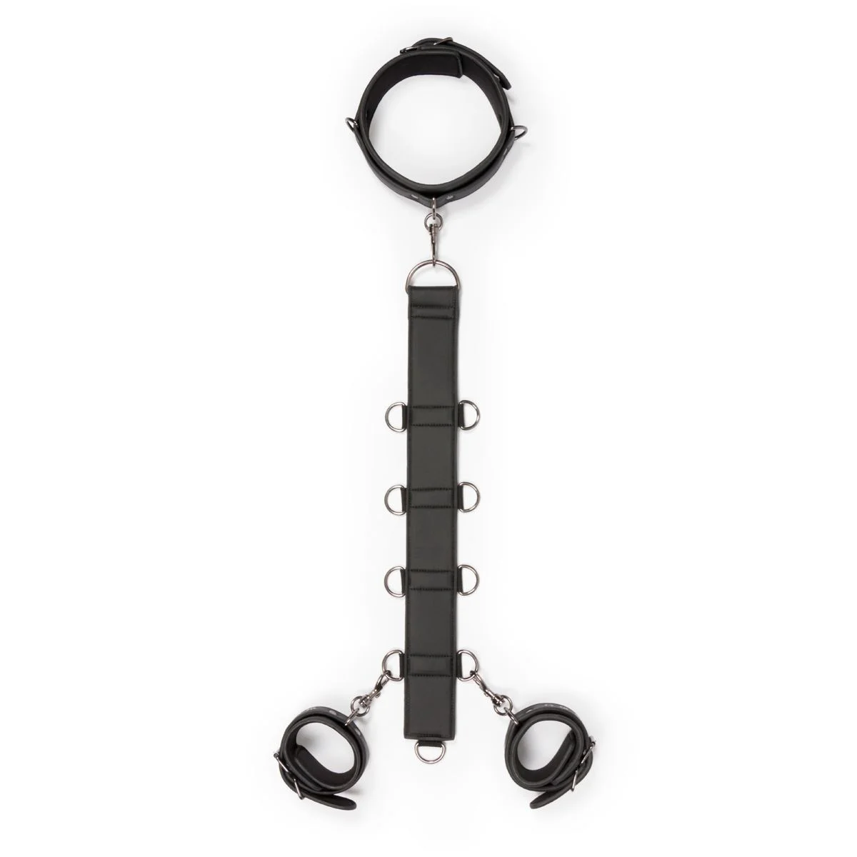 Doordat meerdere ringen aanwezig zijn op de rugband kan je wanneer je de enkelboeien ook bezit alle ledematen vast zetten. Erg leuk speeltje!
