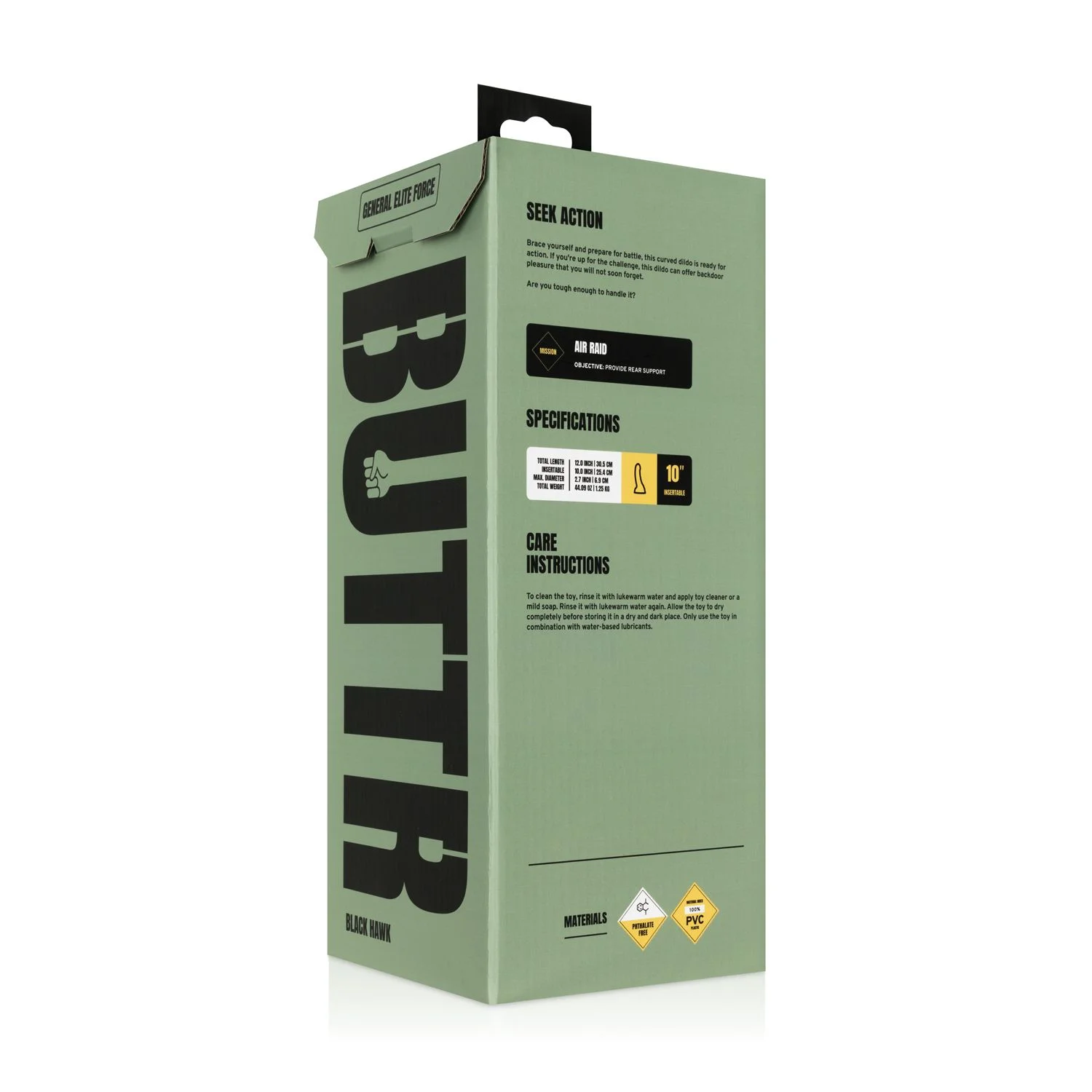 25,4 cm inbrengbare lengte en een maximale diameter van 6,9 cm maken de BUTTR - Black Hawk Gebogen Anaal Dildo een uitgesproken keuze voor ervaren gebruikers. De forse afmetingen geven direct een vol en stevig gevoel, terwijl het gebogen ontwerp gericht werkt voor wie bewust op zoek is naar diepe, precieze stimulatie. Dit is geen slanke instapper, maar een grote dildo voor wie gewend is aan meer omvang en controle. De zwarte afwerking en het stoere silhouet geven het speeltje bovendien een krachtige uitstraling die past bij de rest van je collectie.