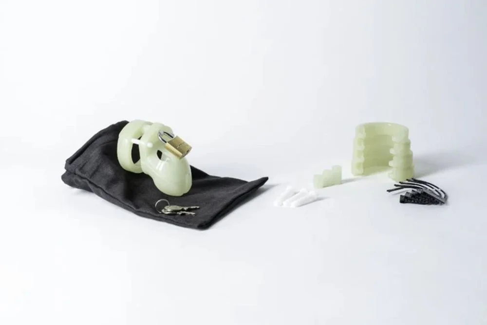 Wat deze kuisheidskit bijzonder maakt, is de Glow-in-the-Dark functie die het kuisheidsspel letterlijk naar een hoger niveau tilt. Door blootstelling aan diverse lichtbronnen zoals UV-licht, zonlicht, of traditionele lampen, laden de fosforhoudende onderdelen op waardoor ze in het donker oplichten. Dit geeft niet alleen een verrassend visueel effect maar versterkt ook de speelse en spannende sfeer die hoort bij BDSM en kuisheidsspel. De kit wordt compleet geleverd met verschillende U-ringen, vergrendelingspinnen, afstandhouders en sloten, zodat jij of je partner de ultieme maatwerkervaring kunt creëren die aansluit bij jullie wensen.
