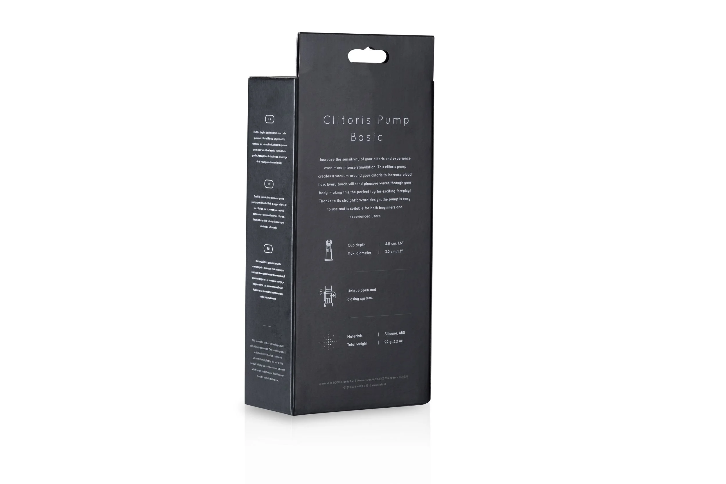 De Clitoris Pump Basic die ik heb getest voor jullie zat in een zwarte verpakking met witte tekst, hij is zwart met een doorzichtig cupje, dat een diepte heeft van 4 cm en een diameter van 3.2 cm. De clitoris pump is gemaakt van siliconen, abs en weegt hij 92 gram.