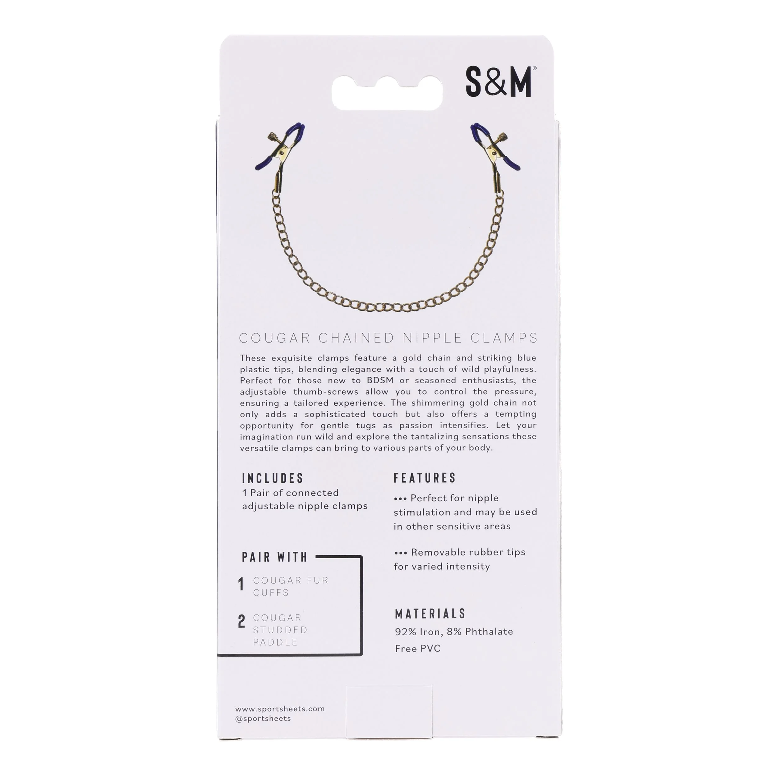 Ontdek de verfijnde allure van de Cougar Tepelklemmen met Ketting - Goud, een intiem product van het gerenommeerde merk Sportsheets. Deze tepelklemmen zijn ontworpen om elegantie te combineren met een speelse, ondeugende twist. Met hun opvallende gouden ketting en stijlvolle blauwe kunststof uiteinden vormen ze een smaakvolle toevoeging voor iedereen die zijn of haar erotische avonturen wil verdiepen. Dankzij de verstelbare schroeven heb je volledige controle over de druk, waardoor je de intensiteit van de klemmen precies kunt afstemmen op jouw persoonlijke voorkeuren.