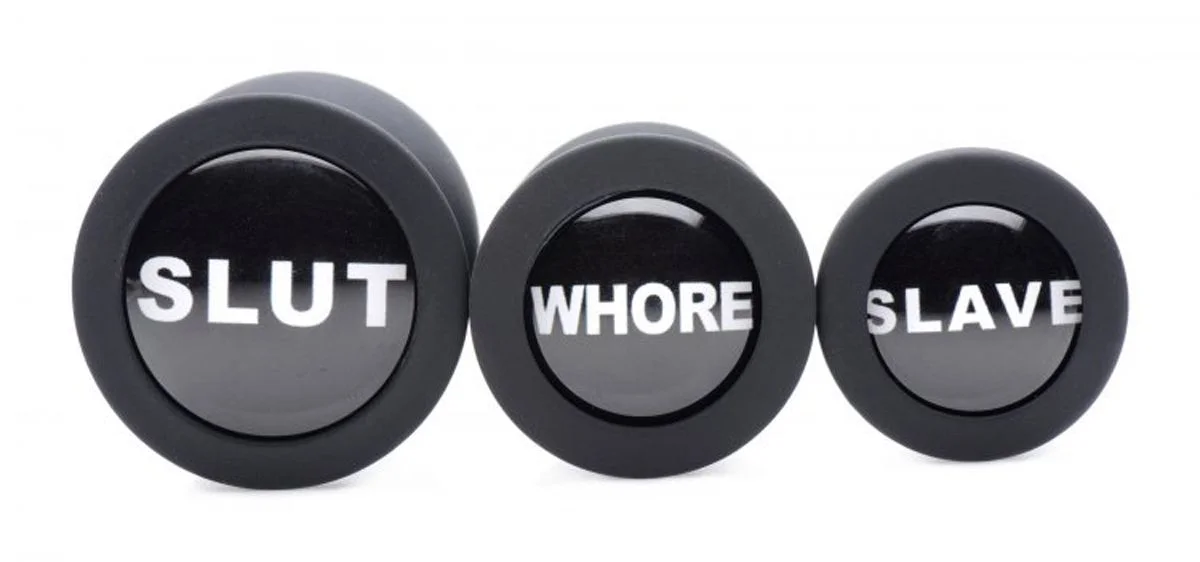 Elke buttplug in deze set is niet alleen functioneel maar ook expressief: op de platte onderzijde zijn ondeugende woorden zoals 'Slut', 'Whore' en 'Slave' verwerkt. Deze teksten brengen een speelse en uitdagende twist in het intieme spel en bieden een leuke manier om je stemming of voorkeur aan te geven. Dankzij de waterdichte eigenschappen is de set eenvoudig te reinigen, wat hygiëne en gebruiksgemak garandeert.