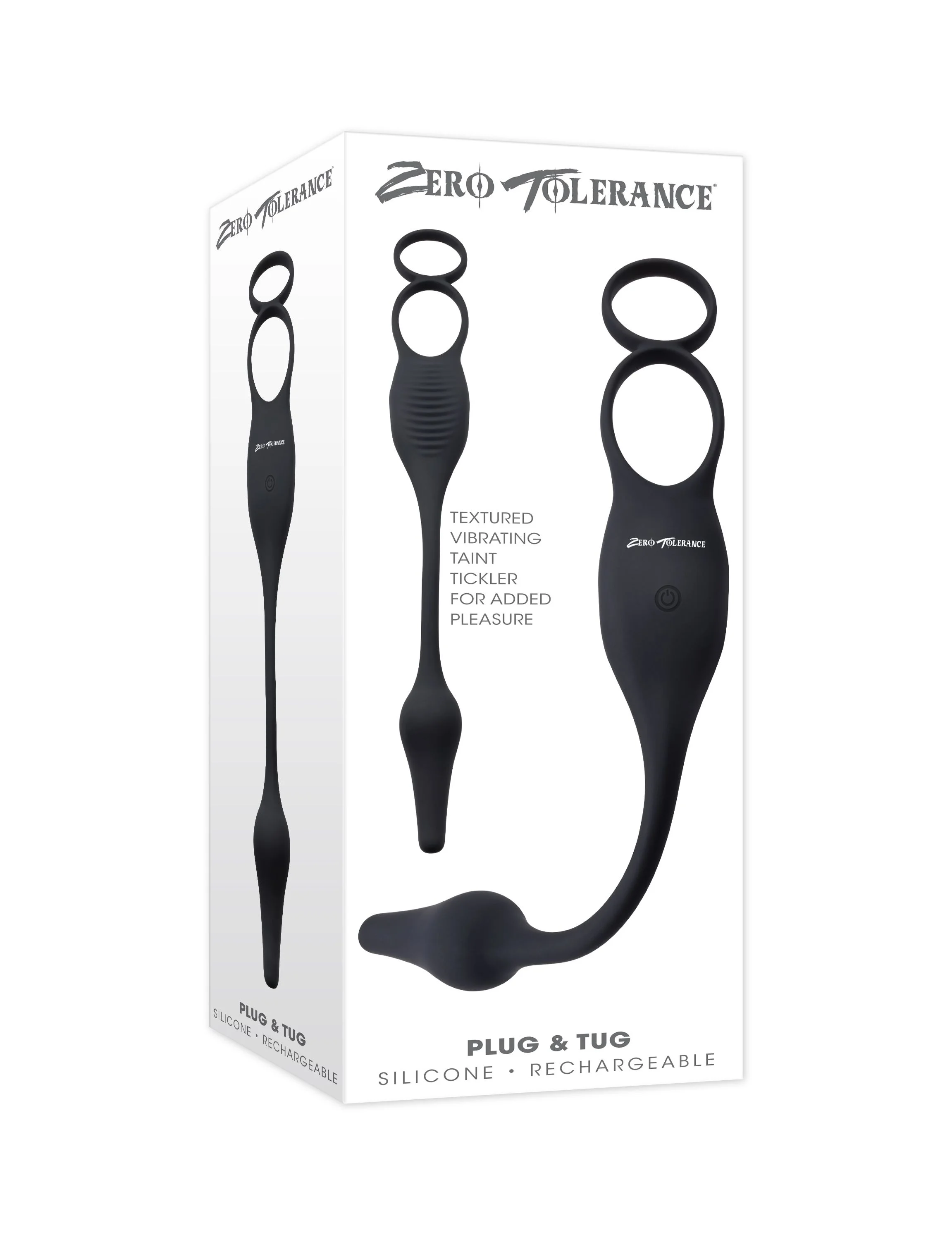 Ontdek de unieke combinatie van plezier en comfort met de Evolved Novelties - Plug & Tug - Zwart van Zero Tolerance. Dit innovatieve speeltje combineert een vibrerende plug met een penisring, wat zorgt voor een dubbele sensatie die zowel de penis als het perineum op een aangename manier stimuleert. Dankzij de twee elastische siliconen ringen worden schacht en ballen comfortabel op hun plek gehouden, waardoor je intens genot ervaart zonder concessies aan draagcomfort. De smal toelopende plug biedt extra flexibiliteit en een comfortabele pasvorm, ideaal voor zowel beginners als ervaren gebruikers.