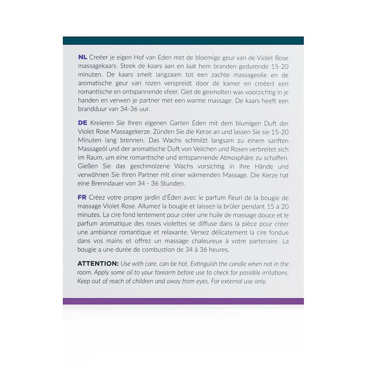 Let op: bij gebruik op een gevoelige huid kan verbranding of reactie van de huid optreden. Het is daarom aan te raden om de kaars altijd vooraf aan gebruik eerst op de huid te testen. Doe dit door de kaars na 15-20 branden uit te blazen, een druppeltje was op je handen te gieten en op de huid te testen.
