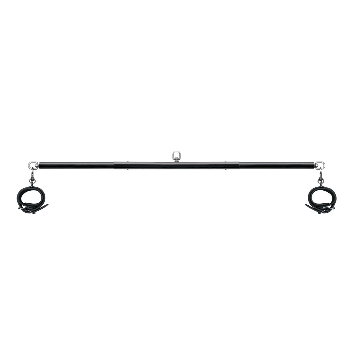 Mijn eerste indruk van de toy is dat hij heel solide is. De spreader bar kan je aanpassen in breedte, welke varieert tussen de 70 cm en 90 cm. Daarnaast zit er in het midden van de stang een ring, welke je kan gebruiken om de stang vast te maken aan het plafond. Hoe graag ik deze optie zou willen uitproberen, ik ben toch bang dat mijn gipsplaten plafond naar beneden komt storten. Dit heb ik dus helaas niet kunnen testen, maar dat dit een mogelijkheid is van de spreaderbar vind ik heel leuk. Dat betekent echter niet dat de ring helemaal geen functie heeft. Je kunt de ring namelijk ook gebruiken om enkelboeien of handboeien aan vast te maken, zodat je echt geen kant op kunt.