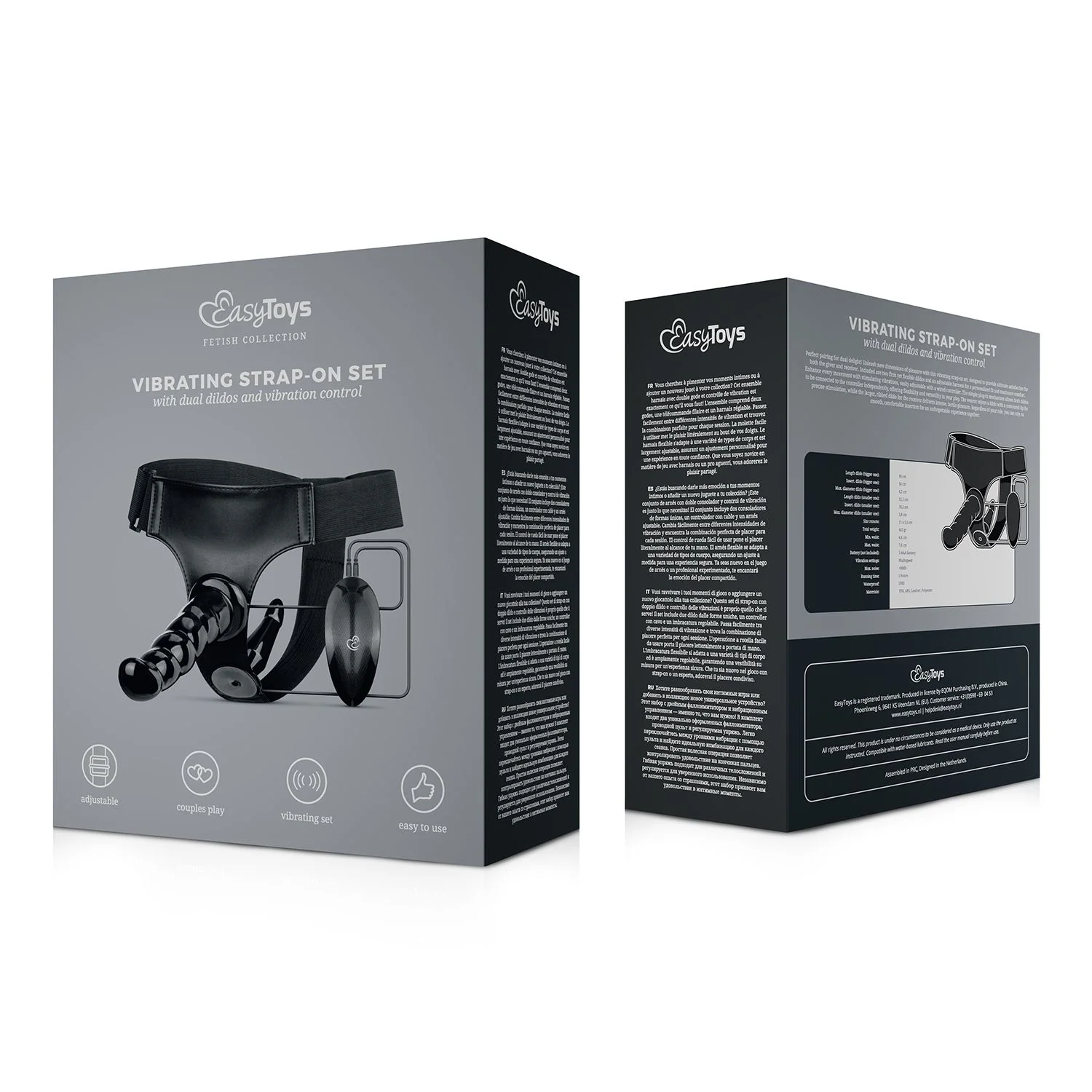 De Fetish - Vibrerende Strap-On Set - Zwart is de ideale keuze voor iedereen die een nieuwe dimensie wil toevoegen aan hun intieme belevenissen. Deze veelzijdige strap-on set van Fetish Collection is ontworpen voor zowel beginners als gevorderden, en biedt dankzij de twee uniek gevormde dildo's met ribbelstructuur een gevarieerde en stimulerende ervaring. Gemaakt van stevig maar comfortabel glad PVC, zorgt elk stuk voor soepel en prettig inbrengen, terwijl de ribbels extra sensatie toevoegen voor intens genot.