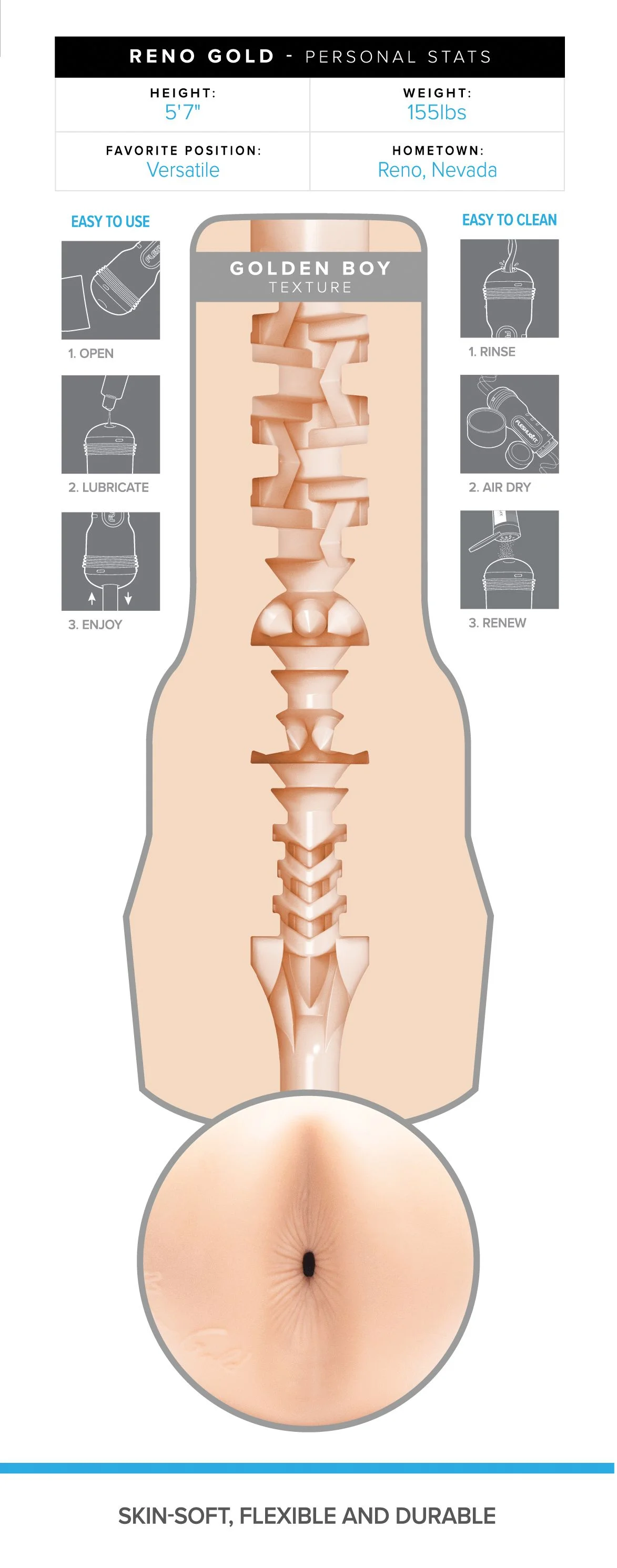 Er is weinig subtiels aan de verpakkingen van Fleshlight. Het is duidelijk wat er in de doos zit en waarvoor je het gebruikt. Het is een eenvoudige kartonnen doos met afbeeldingen van Reno Gold en wat feitjes over de man wiens ‘kont’ ik zou in glijden. Zoals ik al zei, heeft de blauwe behuizing iets extra’s, een soort visuele aantrekkingskracht. Hoe iets eruit ziet is voor mij net zo belangrijk als het gevoel.