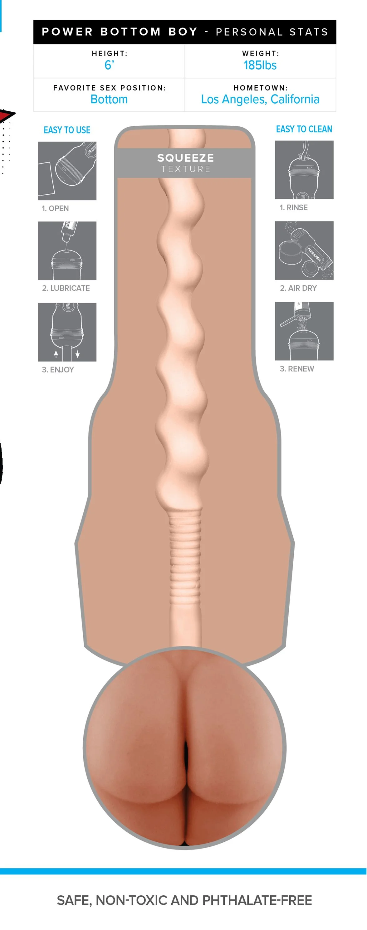 De Power Bottom Boy onderscheidt zich door de legendarische "squeeze sensation" die Fleshlight heeft gecreëerd. Deze unieke techniek zorgt ervoor dat de anale tunnel aanvoelt als een echte anus, met fijne ribbels die elke beweging extra stimuleren. Dankzij de verstelbare dop aan het uiteinde van de behuizing bepaal je precies hoe strak de zuigkracht moet zijn. Hiermee pas je jouw ervaring aan jouw persoonlijke wensen aan, wat het product geschikt maakt voor zowel beginners als ervaren gebruikers die houden van realistische masturbators.