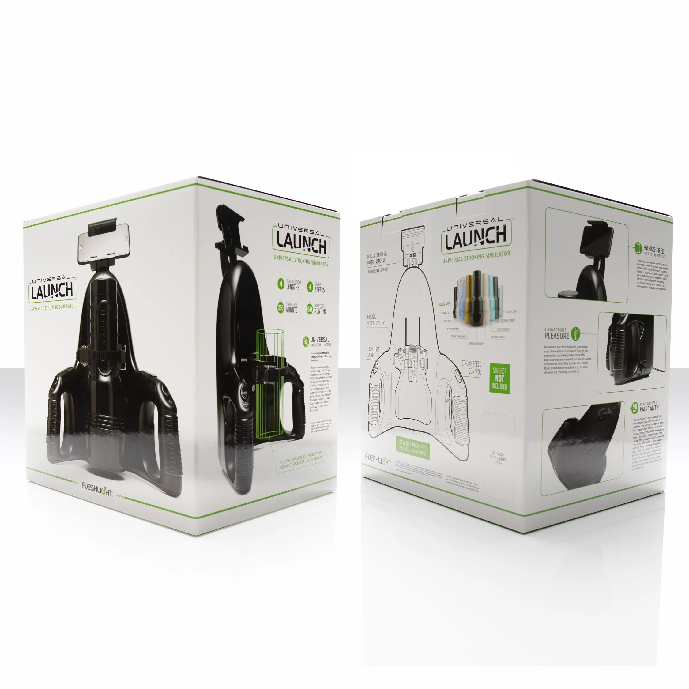 Ja, hij is groot. Vergis je daar niet in. De doos waarin het aankwam was behoorlijk omvangrijk en ik begon me een klein beetje ongerust te voelen. Waar moet ik ‘m opbergen? Gelukkig was dit al snel opgelost. Enfin, wat betreft de verpakking is de Universal Launch gewoon smaakvol verpakt. Er staan geen naakte mensen op de zijkant en het is gewoon een witte doos met afbeeldingen van Fleshlights, de Universal Launch en wat USP’s. Binnenin wordt het apparaat op zijn plaats gehouden met een schuimrubberen kussen en hierin vind je weer de oplaadkabel en een tal aan onderdelen, waaronder een universele smartphonehouder. Heel handig als je bijvoorbeeld een ‘natuurfilm’ wilt kijken tijdens het gebruik.