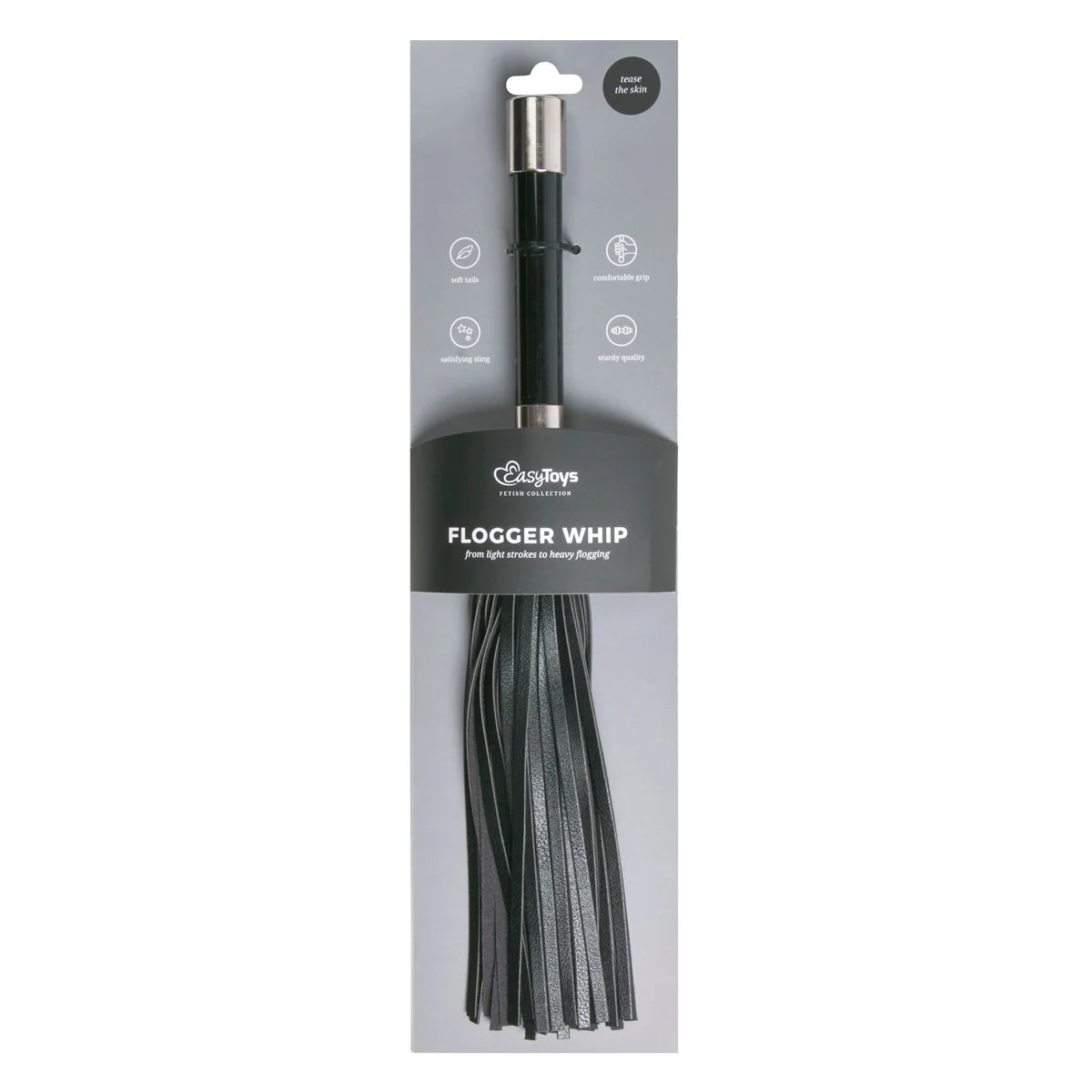 De flogger maakt onderdeel uit van de Excitante Fetish Collection. Deze collectie bestaat uit een serie betaalbare, goede basisspeeltjes. Dit zweepje wordt geleverd in een eenvoudige plastic verpakking waarbij hij bevestigd is op een stuk karton. Je kunt wel een dure chique doos willen, maar daar betaal je dan ook voor. De flogger bestaat uit een zwart handvat, gemaakt van aluminium en ABS plastic en de strengen zijn gemaakt van faux-leather, aldus nepleer. Hij is 44 cm lang, waarbij het handvat 15 cm is. Het handvat voelt zwaar en stevig aan. Op mij kwam het handvat netjes afgewerkt over, maar mijn man had wat aanmerkingen op hoe het metaal was afgewerkt. Niet helemaal netjes gepolijst, zei hij. Er zitten geen scherpe randen aan, dus wat mij betreft is het netjes genoeg. De stof van de strengen is zacht en aangenaam aan je vingers als je er doorheen glijdt. Je voelt ook dat de stof licht is qua gewicht. Wat mij opviel is dat er geen lus aan het handvat zit. Daar heb ik verder geen oordeel over, maar vaak zie je dat wel bij dit soort floggers.