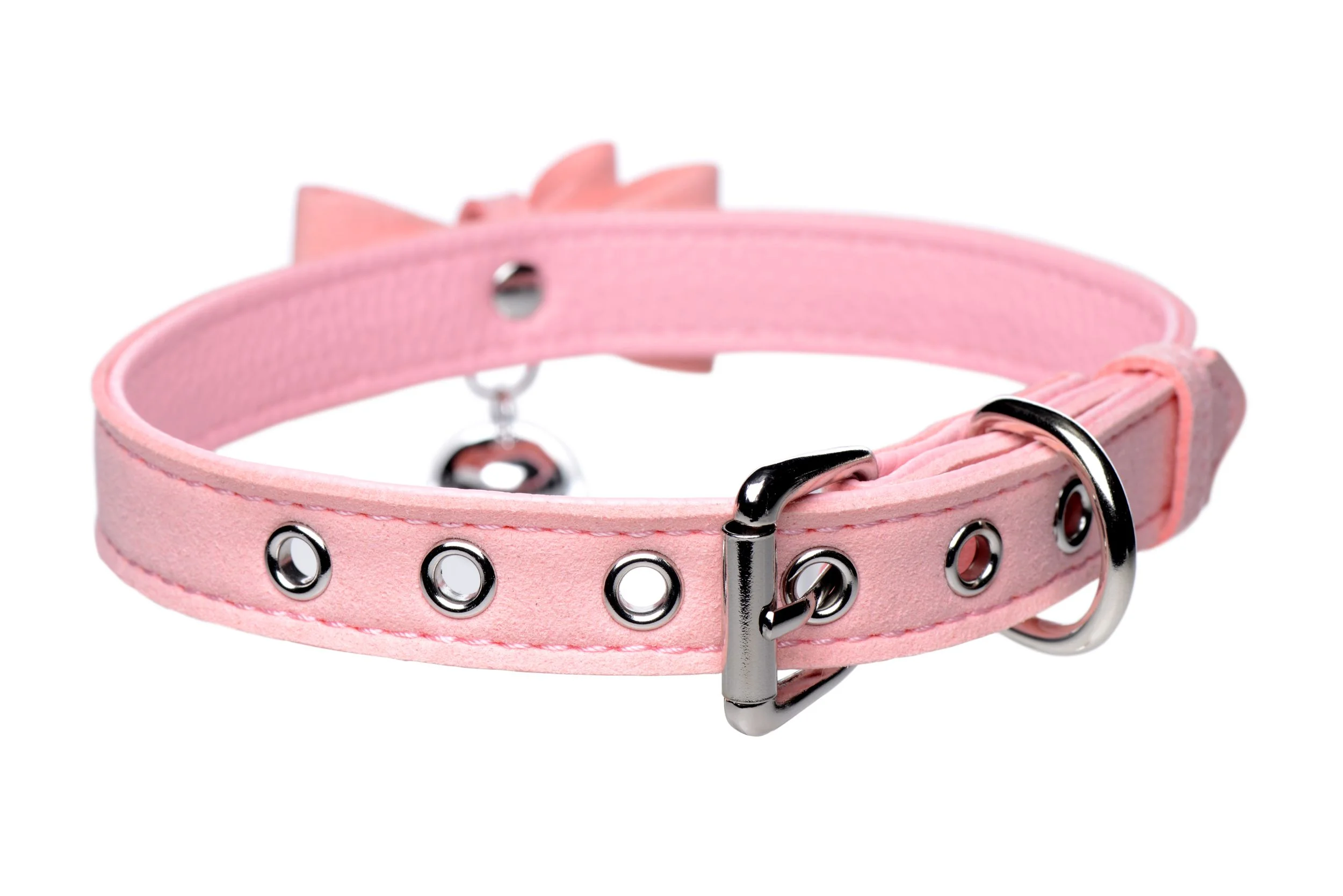 De Golden Kitty Collar Met Kattenbelletje - Roze/Zilver van XR Brands is een elegant en speels accessoire, perfect voor liefhebbers van stijlvolle BDSM collars. Deze unisex collar valt direct op door het charmante strikje in combinatie met een klein, vrolijk metalen kattenbelletje. Het subtiele belletje voegt niet alleen een speels geluid toe, maar geeft de collar ook een onderscheidende uitstraling binnen het brede assortiment bondage accessoires.
