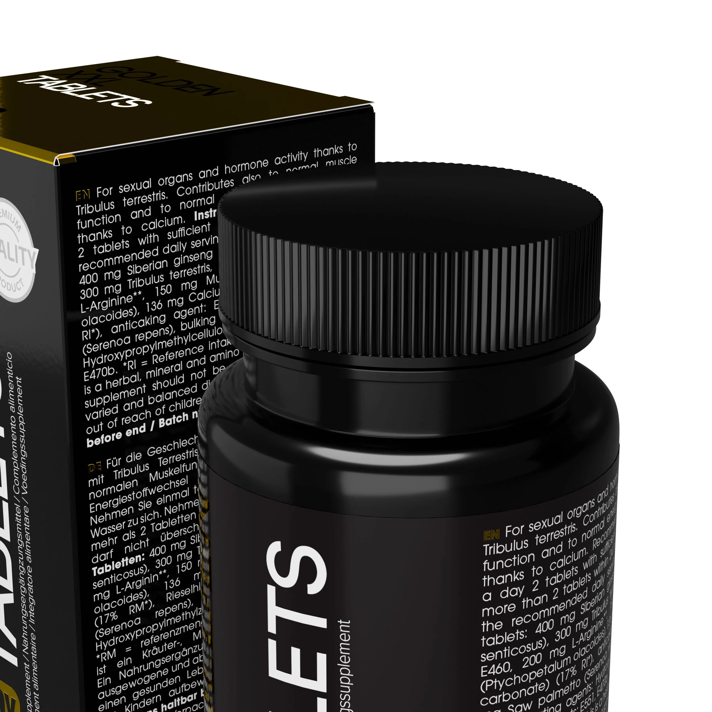 Ingrediënten per 2 tabletten: 400 mg Siberische ginseng (eleutherococcus senticosus), 210 mg calcium (calciumcarbonaat) (26% ADH), 200 mg L-Arginine, vulstof: E460, 150 mg muira puama (ptychopetalum olacoides), 100 mg zaagpalm (serenoa repens), 100 mg tribulus terrestris, vulstof: E466, antiklontermiddel: E570, coating: hydroxypropylmethylcellulose, (drager: triacetine), carnaubawas, antiklontermiddelen: E551, E572.