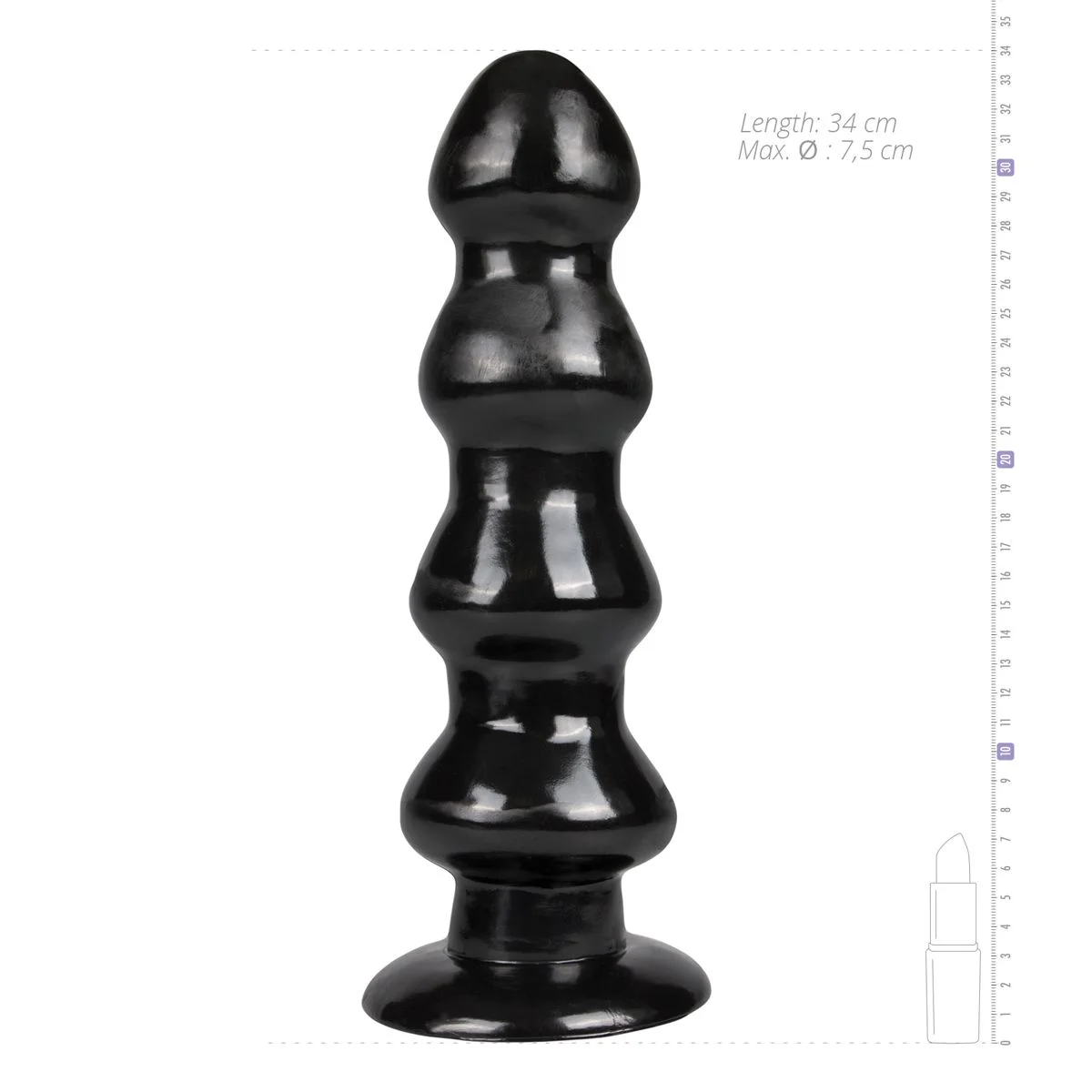 Zelf heb ik een "big boy" van Doc Johnson en deze gaat (mits wat voorbereiding) er vlot volledig in en uit. Dus ik wou wat groters proberen en heb deze gekocht. Hij is 32cm hoog waarvan je 30cm kan inbrengen. De bovenste kop heeft een diameter van 7cm, de onderste heeft een diameter van 9cm. Hij heeft een goede, grote zuignap die gemakkelijk aan de muur blijft hangen. Wel wat prijzig, hopelijk een toy die lang meegaat!