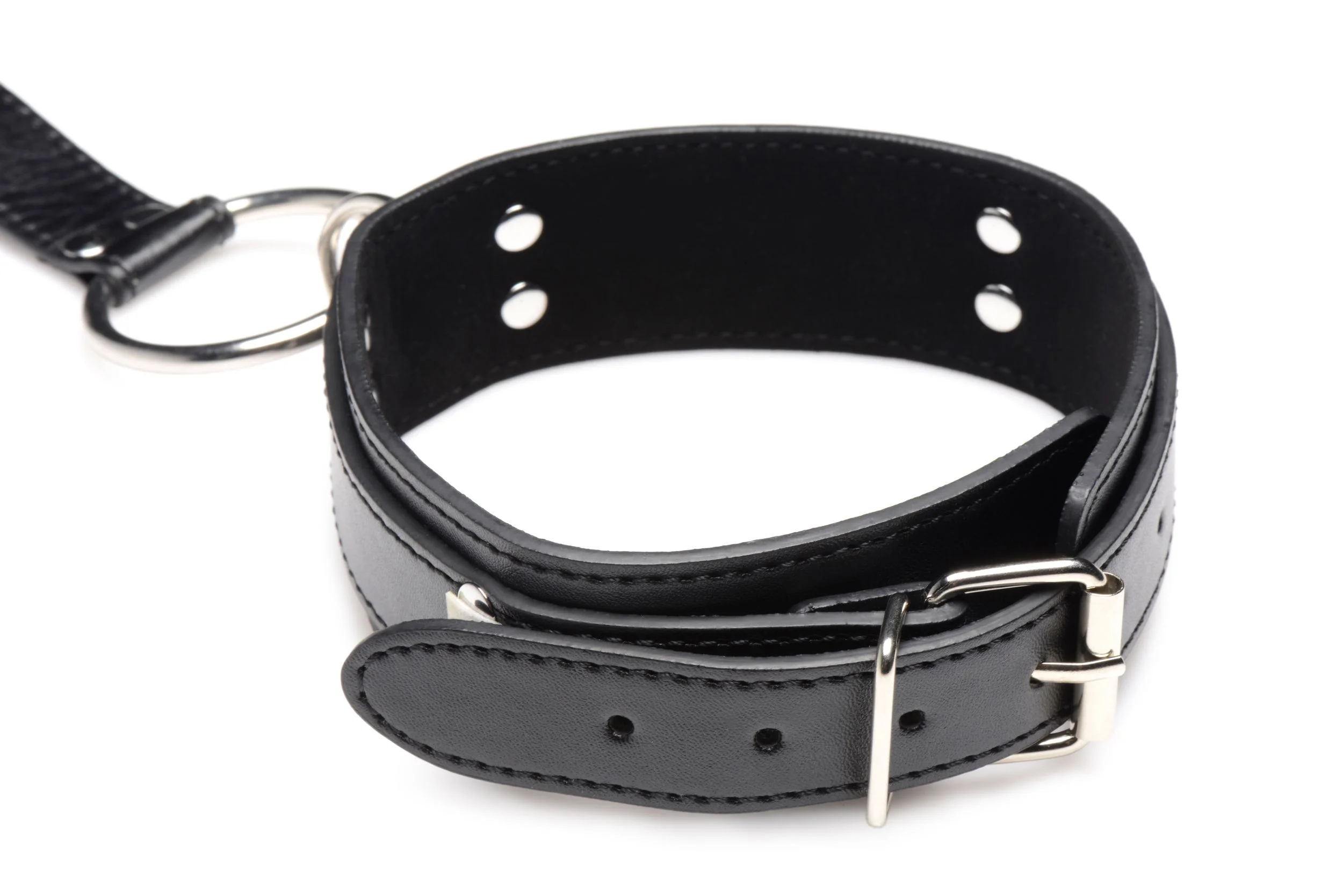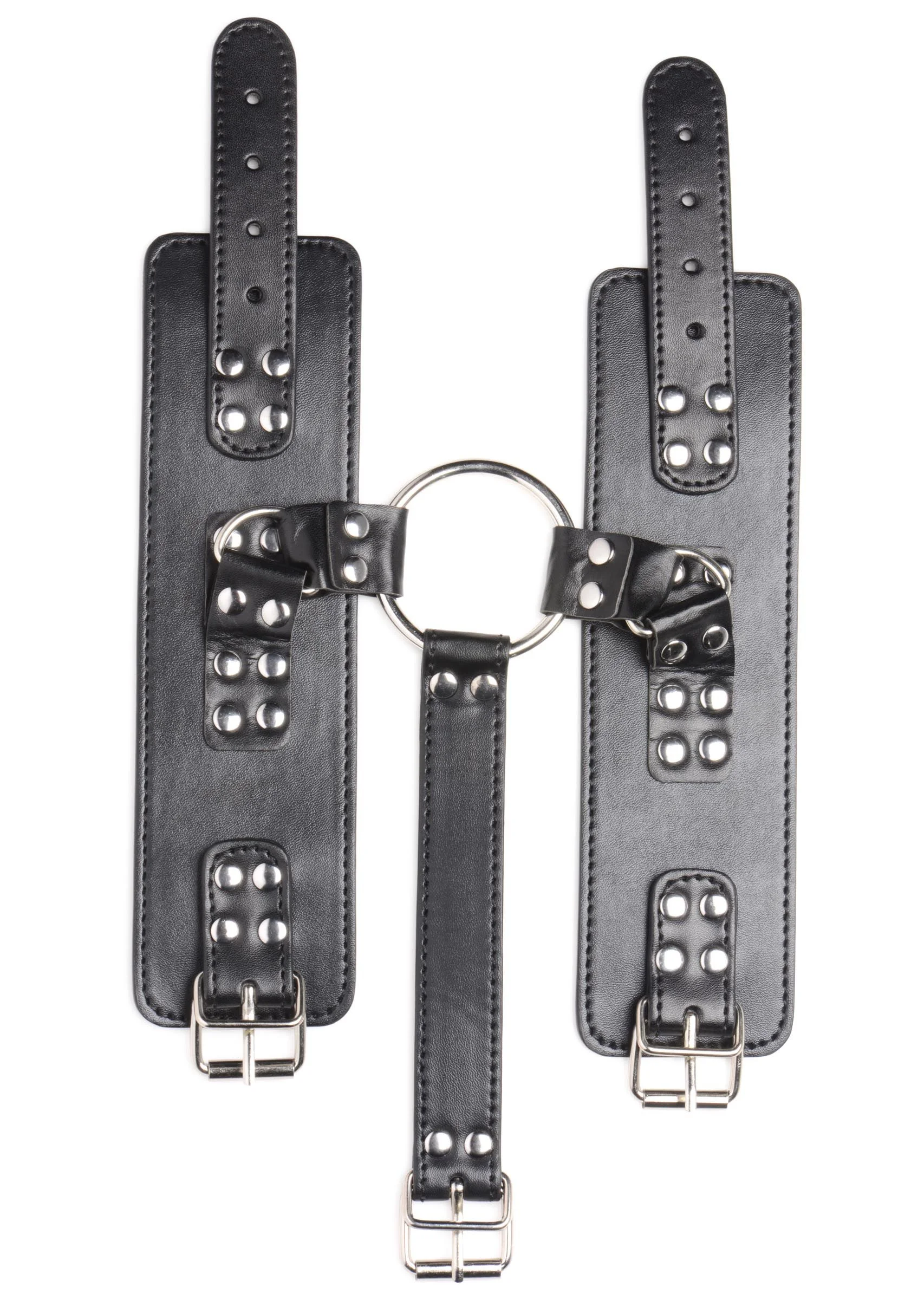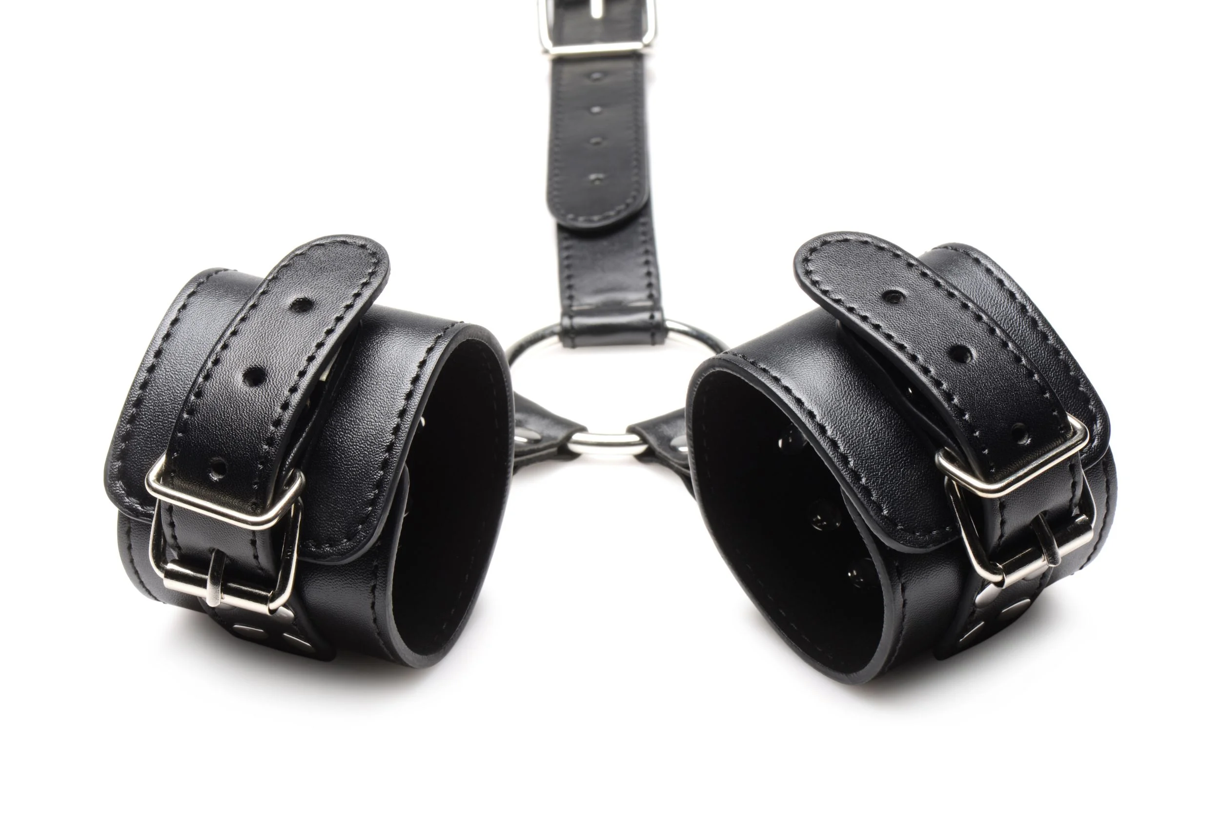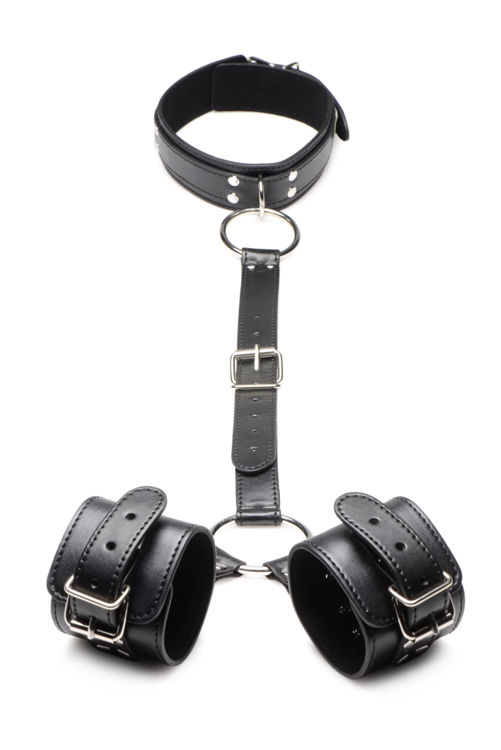 Bind je sub vast met deze nek-aan-pols-boeien! De zachte binnenvoering is zacht voor de huid voor optimaal comfort in elke positie. Het vegan PU-leer is eenvoudig schoon te maken en behoudt toch de sexy, klassieke leerlook. De grote O-ringen zijn gemaakt van sterk, nikkelvrij metaal en kunnen voorzien worden van onder andere bondage touwen, kettingen en andere BDSM-producten. Het geheel is ruim verstelbaar voor een perfecte pasvorm bij elk lichaam.