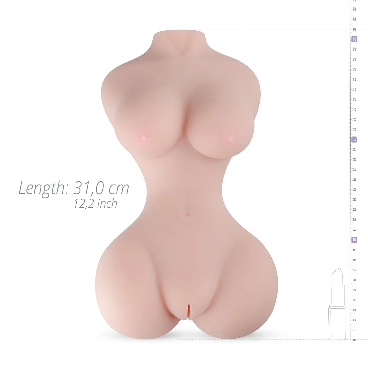 De omtrek van een borst is ongeveer 23 centimeter. De breedte bij de schouders is ongeveer 19 centimeter. De gemiddelde hoogte is ongeveer 12 centimeter. Er is een anaal kanaal en een vaginaal kanaal. Beide kanalen zijn gesloten. Beide kanalen zijn halverwege via een smalle opening met elkaar verbonden om het schoonmaken makkelijker te maken. De verpakking dit zit erin: - de toy in een hard plastic omhulsel