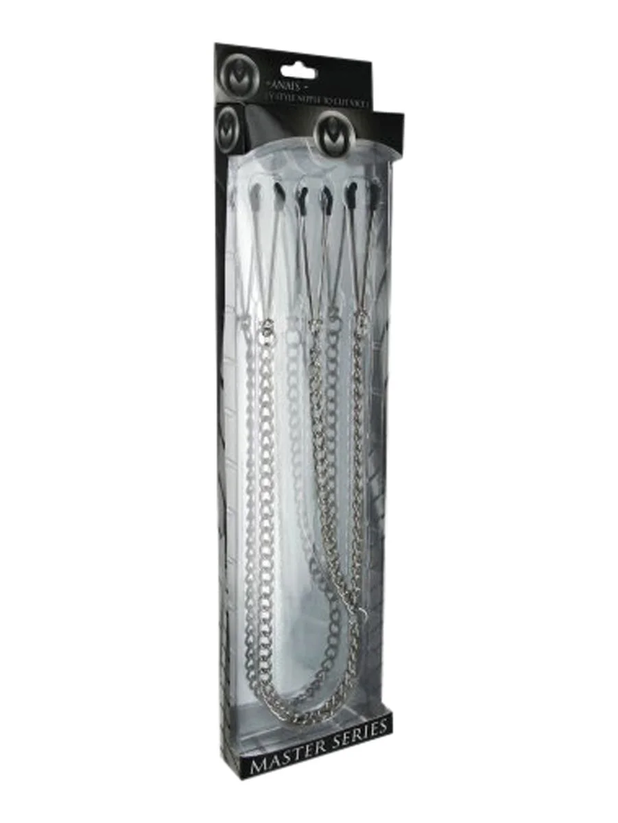 Ontdek de spannende sensaties van de Nipple To Clit Klemmenset, een verfijnd intiem product van XR Brands, speciaal ontworpen voor vrouwen die hun grenzen willen verkennen binnen de wereld van BDSM en erotische stimulatie. Deze unieke klemmenset verbindt twee van haar meest gevoelige zones – de tepels en de clitoris – met elkaar, waardoor een directe sensatiebrug ontstaat die zowel subtiele als intense prikkelingen biedt.