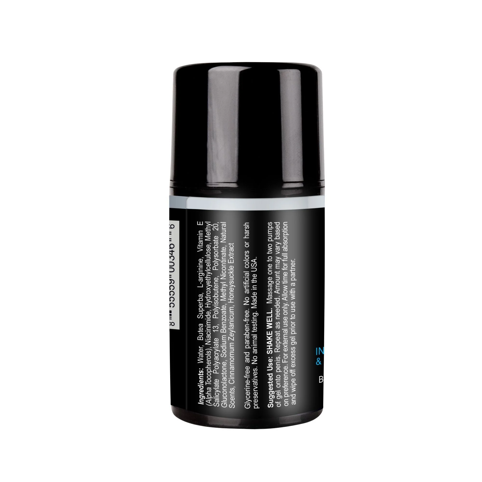 Ingrediënten: Water, Butea Superba, L-arginine, Vitamin E (Alpha Tocopherols), Niacinimide, Hydroxyethylcellulose, Methyl Salicylate Polyacrylate 13, Polyisobutene, Polysorbate 20, Gluconolactone, Sodium Benzoate, Methyl Nicontinate, Natural Scents, Cinnamomum Zeylanicum, Honeysuckle Extract