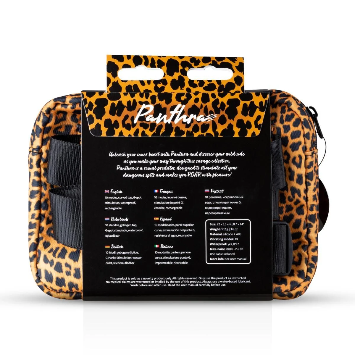 De Nila wordt geleverd in een tasje, dat ook van dezelfde panterprint is gemaakt als het speeltje zelf. In het tasje is ook ruimte om het oplaadkabeltje en eventueel glijmiddel te bewaren. Het tasje is voor mij iets over de top, maar het past wel bij het speeltje en is praktisch om alles in op te bergen. De Panthra Nila is een vibrator bedoeld voor stimulatie van de G-spot, maar kan ook prima voor externe stimulatie worden gebruikt.