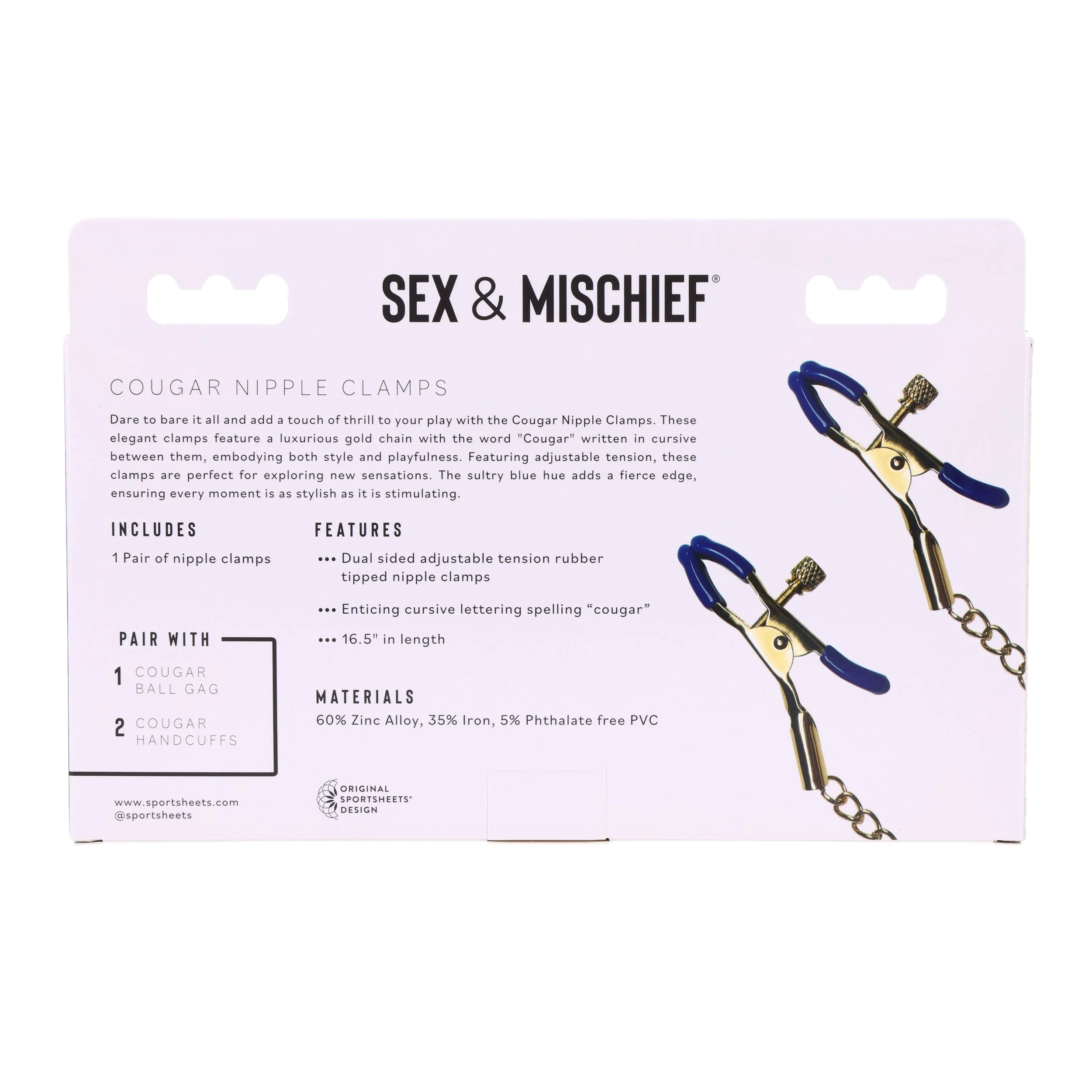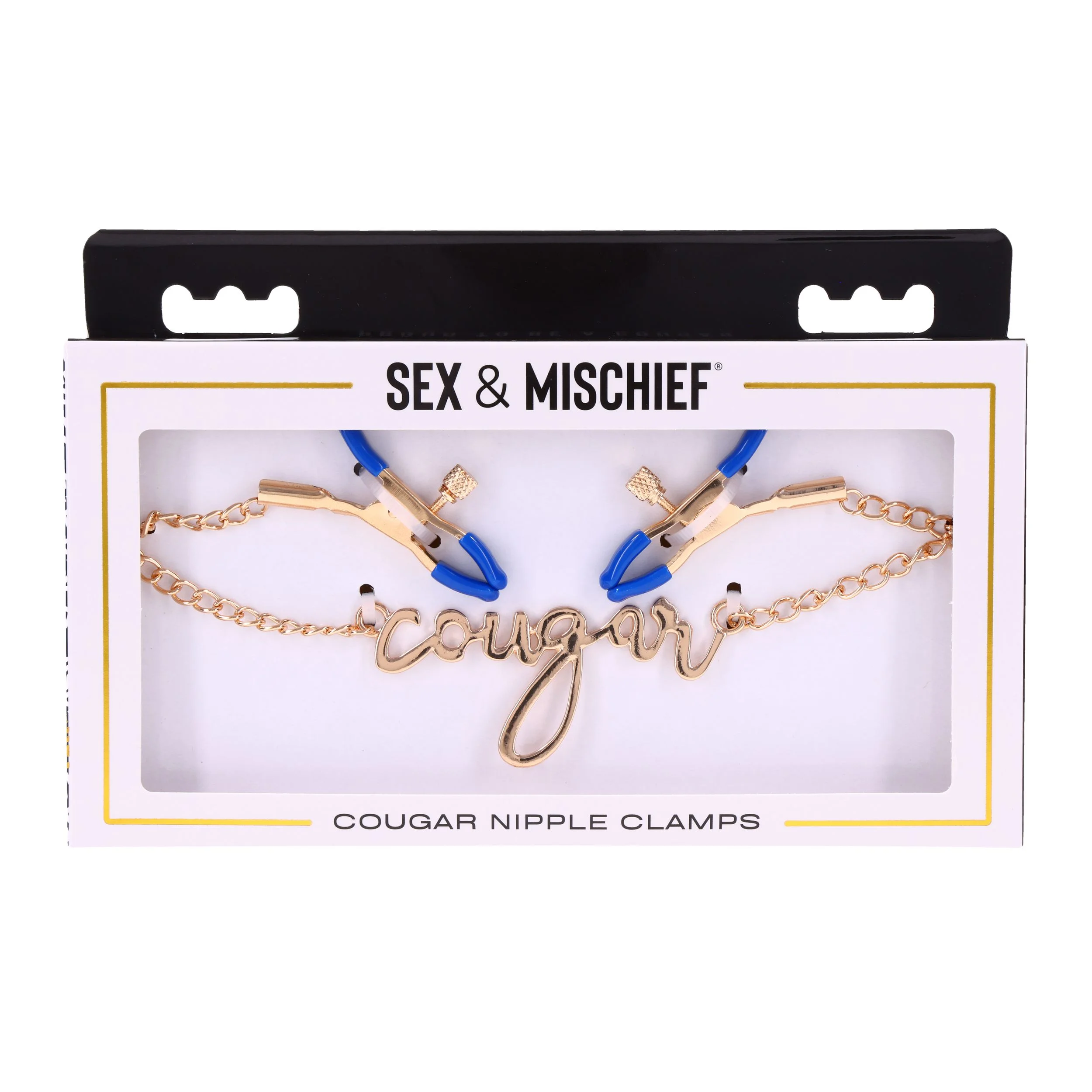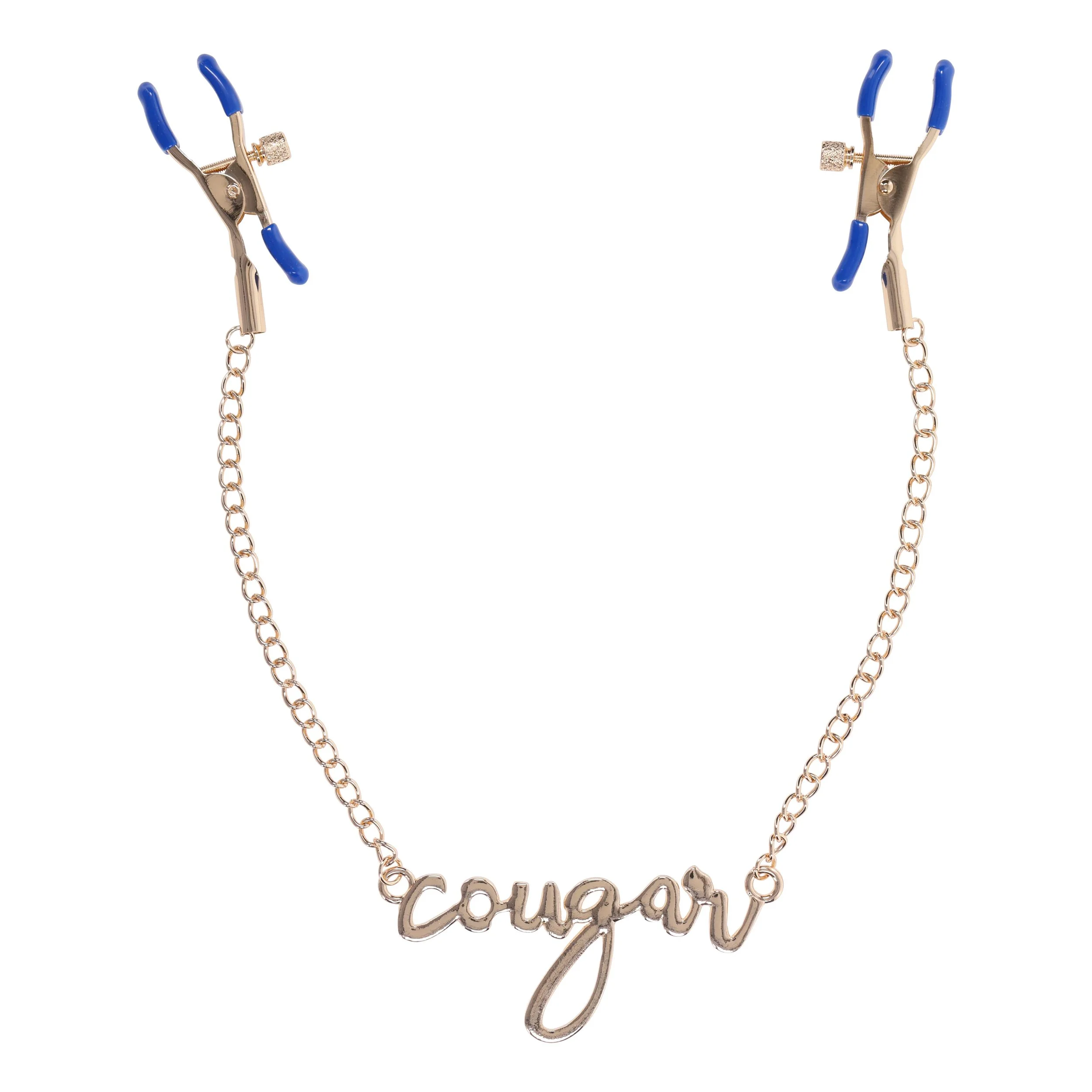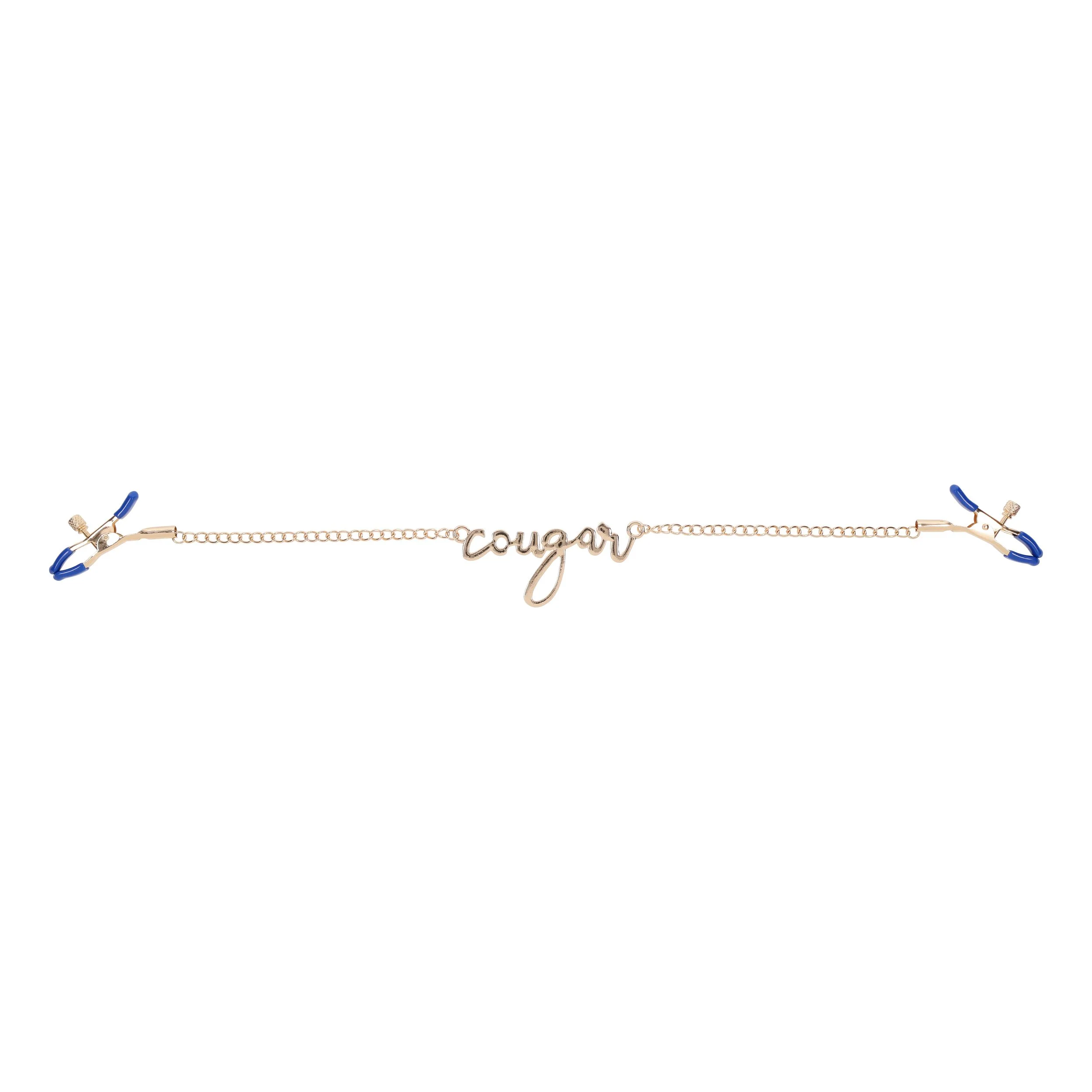 Ontdek de verfijnde luxe van de Sportsheets - Cougar Tepelklemmen - Goud, een elegant en intiem accessoire dat stijl en plezier naadloos combineert. Deze tepelklemmen zijn vervaardigd met een prachtige gouden ketting, voorzien van de subtiele maar opvallende cursieve tekst "Cougar". Dit detail geeft de klemmen niet alleen een onderscheidende look, maar spreekt ook tot een sensuele en speelse ervaring. De blauwe accenten in het design voegen een gewaagde touch toe die perfect past bij iedereen die durft te experimenteren en nieuwe sensaties wil verkennen.