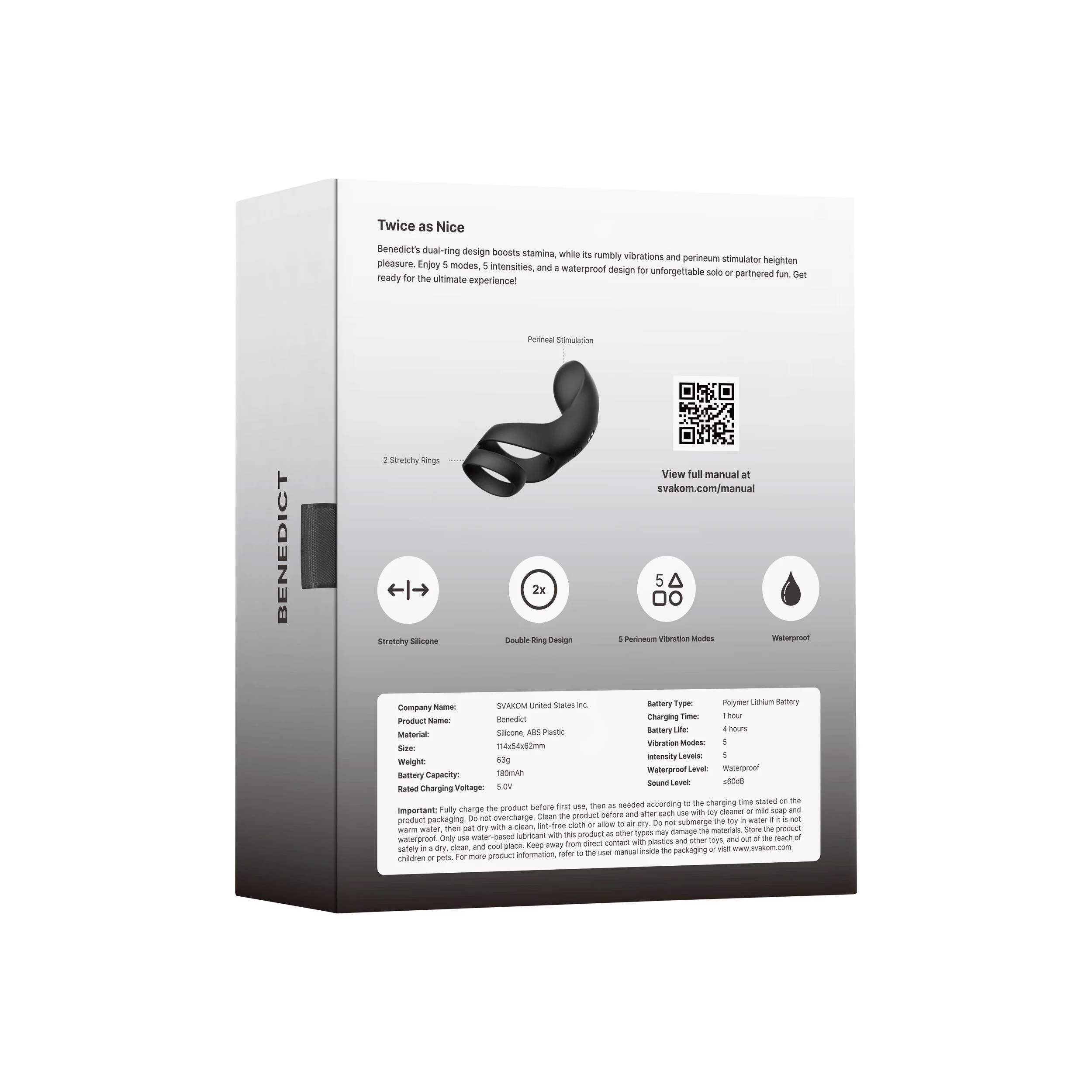 Met de Svakom Benedict Double Ring Perineum Stimulator ervaar je nieuwe dimensies van plezier en ontspanning. Deze cockring is een must-have voor mannen die hun intieme momenten willen verrijken met krachtige vibraties en optimaal comfort.