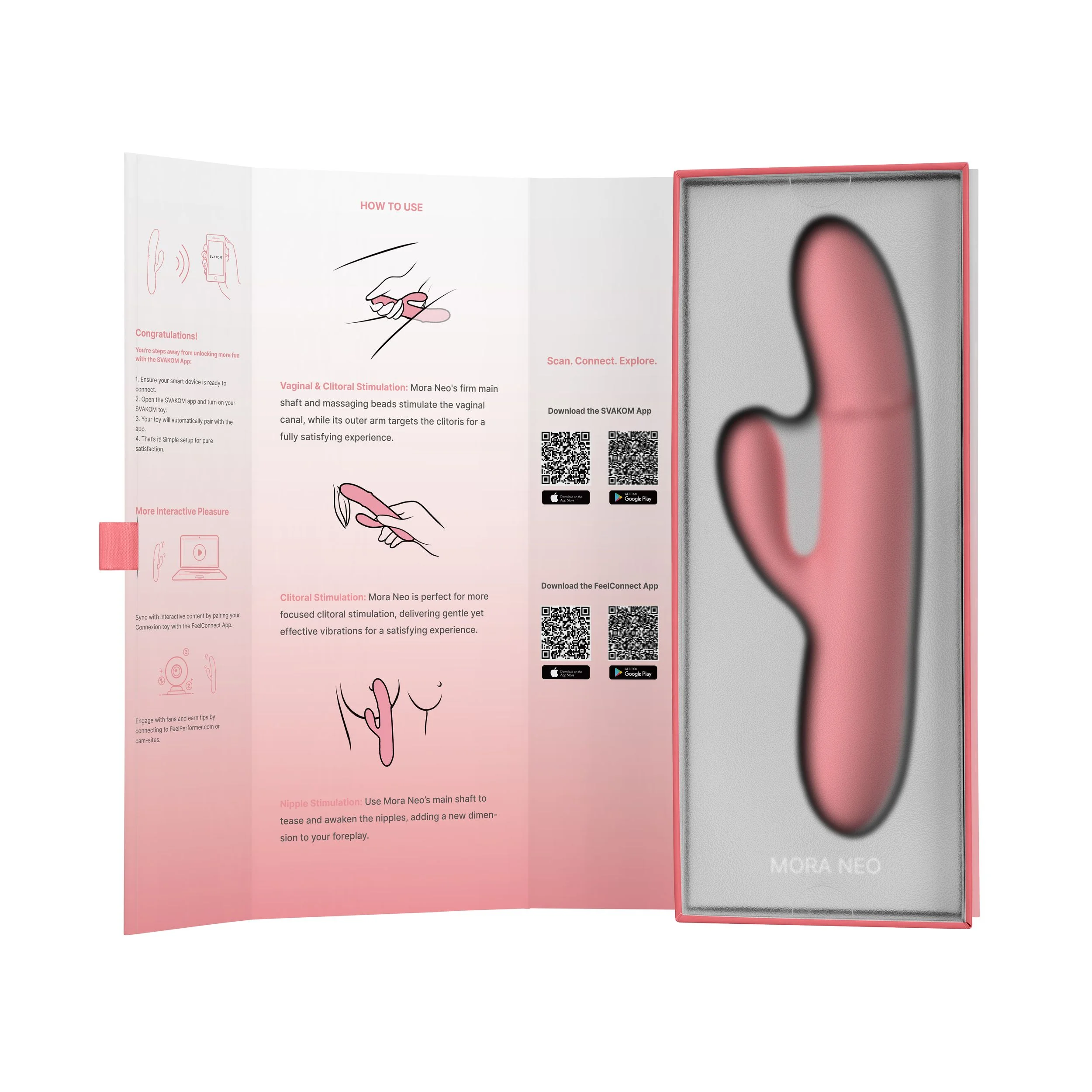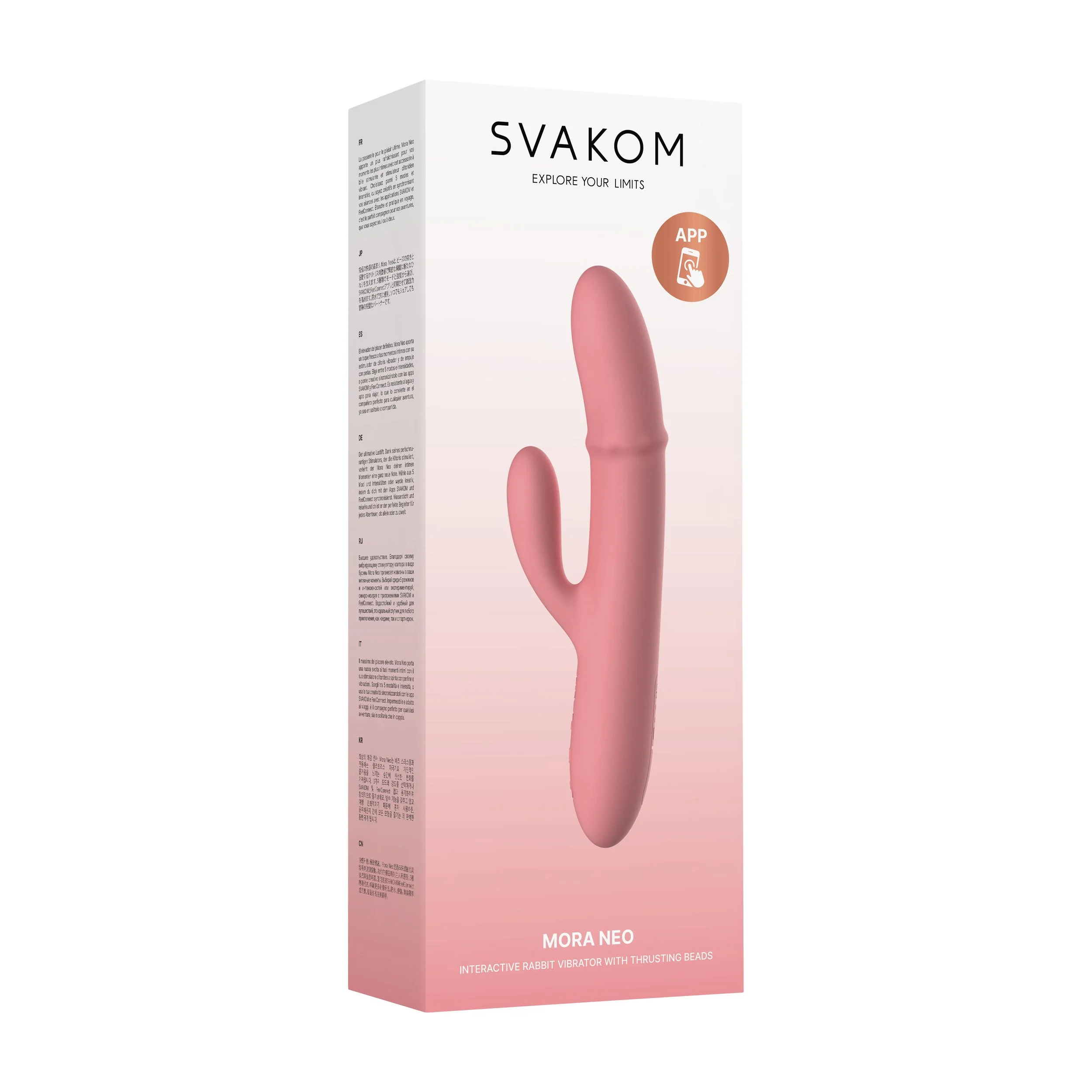 Ontdek de SVAKOM Mora Neo Interactieve Stotende Vibrator in Peach, een revolutionaire vibrator die speciaal is ontworpen voor vrouwen die op zoek zijn naar intense en veelzijdige stimulatie. Met een lengte van 195 mm en een ingebouwde invoerdiepte van 111 mm, biedt deze elegante roze vibrator precies de juiste afmetingen voor een comfortabele en doeltreffende ervaring. De Mora Neo is gemaakt van zijdezachte siliconen en beschikt over een innovatieve stotende kralenring die gericht is op het stimuleren van de G-spot. Dit unieke mechanisme zorgt voor een diepgaande en ritmische stimulatie die zich aanpast aan jouw lichaam en wensen.