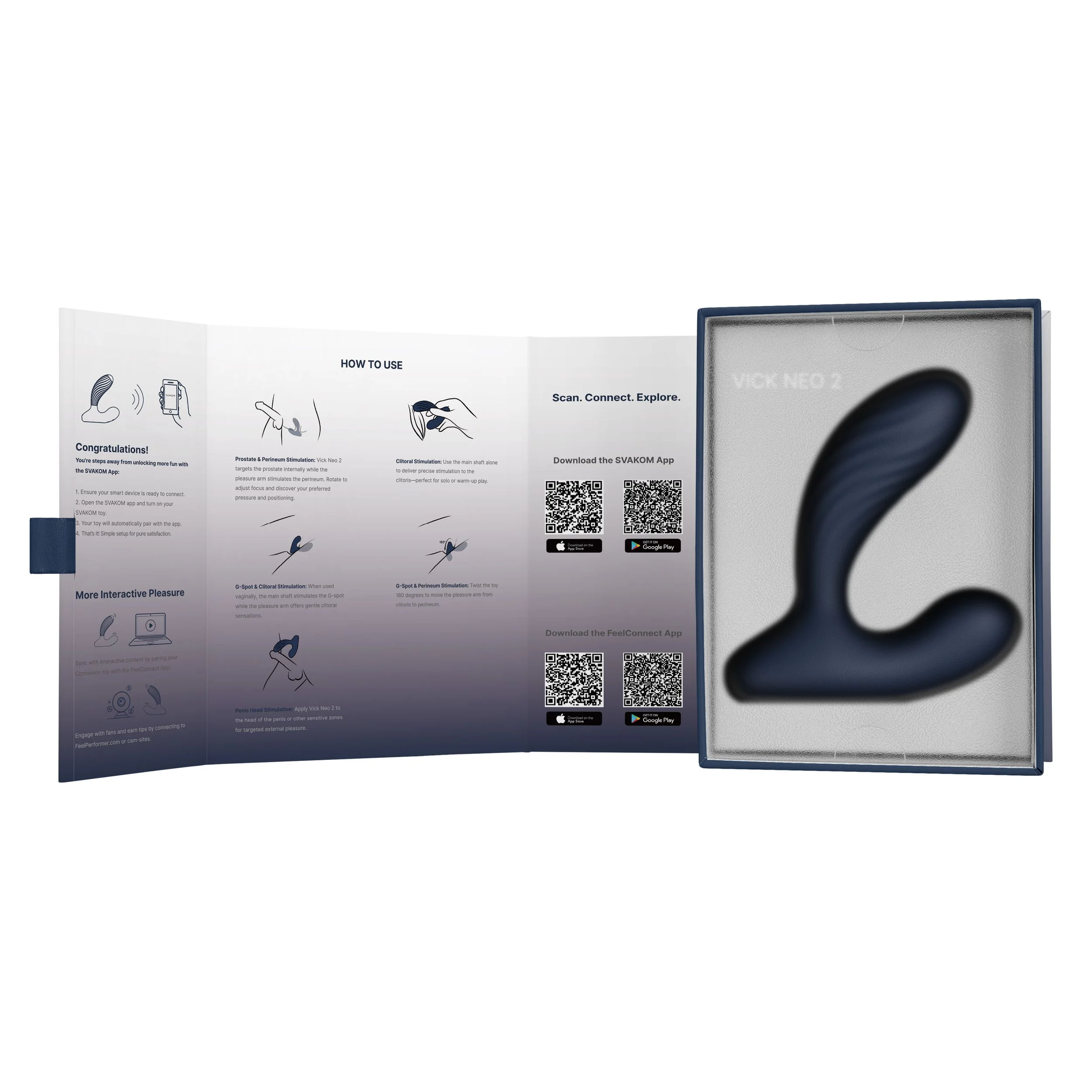 De bediening van de Vick Neo 2 is eenvoudig en gebruiksvriendelijk, met een draadloze magnetische afstandsbediening én een smartphone-app waarmee je de vibraties kunt regelen. Dit maakt het apparaat ook uitermate geschikt voor interactieve sessies en camplay, waarbij je partner op afstand de controle kan nemen. Met een batterijduur van 120 minuten en een oplaadtijd van slechts 150 minuten is deze prostate vibrator ideaal voor langdurig plezier. Door het stille motorgeluid blijft je discreet tijdens je genotservaring.