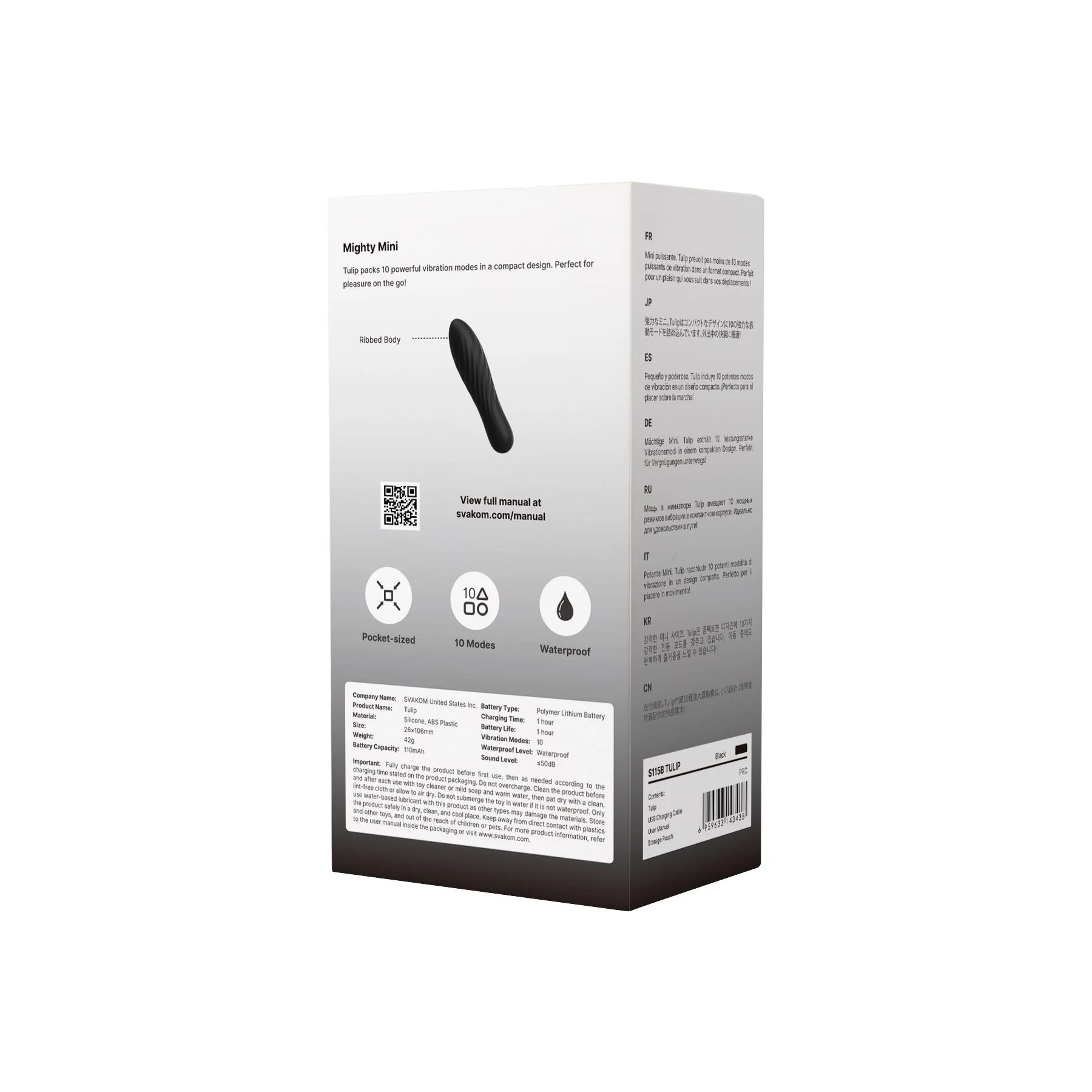 De SVAKOM Tulip Krachtige Vibrator in elegant zwart is de ideale keuze voor wie verlangt naar een combinatie van compact design en krachtige prestaties. Met een lengte van slechts 105 mm en een maximale diameter van 25 mm is deze mini vibrator bijzonder discreet en gemakkelijk mee te nemen. Dankzij het ergonomische ontwerp met geribbelde stimulatoren sluit hij perfect aan op je lichaam en biedt hij een aangename sensatie, zowel voor beginners als voor ervaren gebruikers.