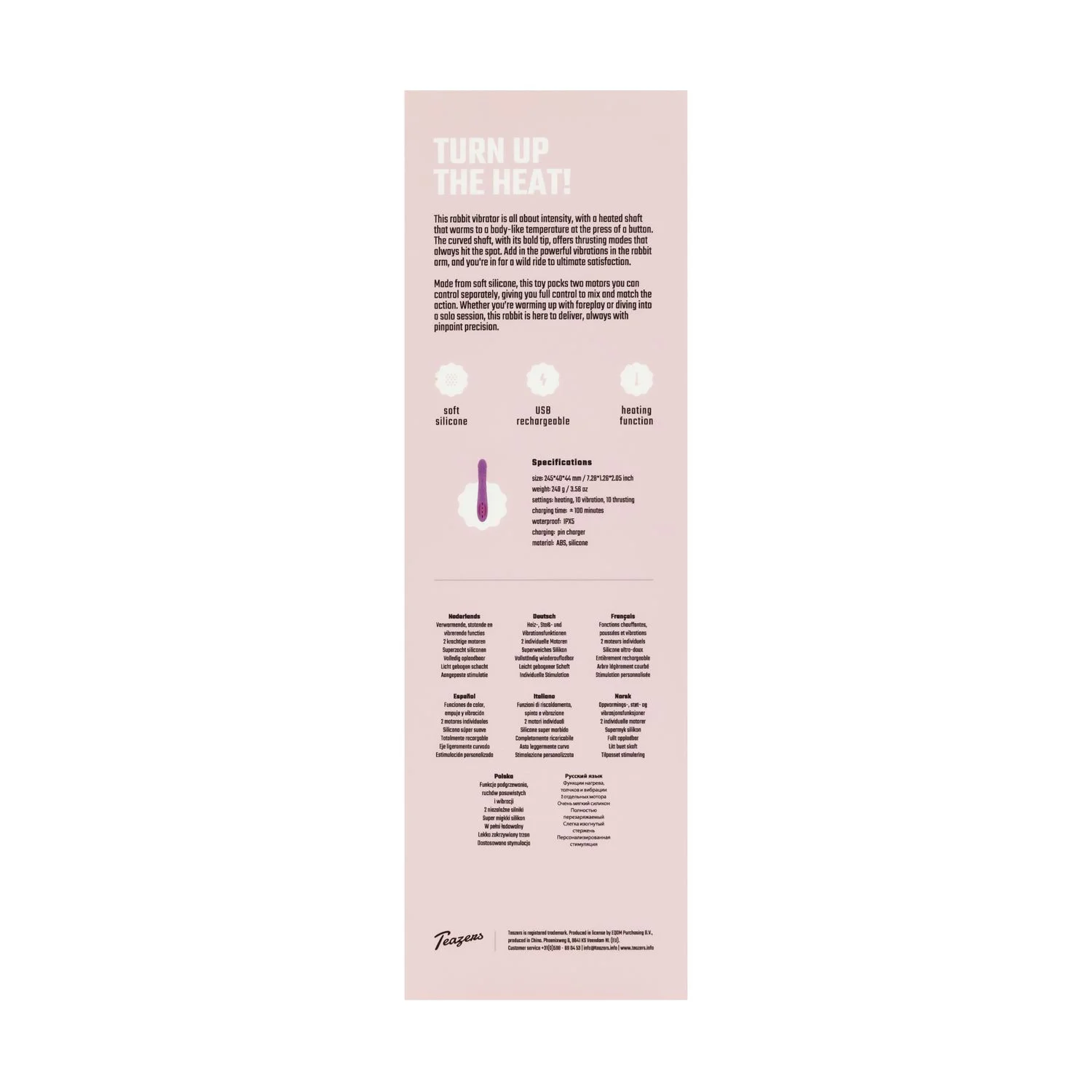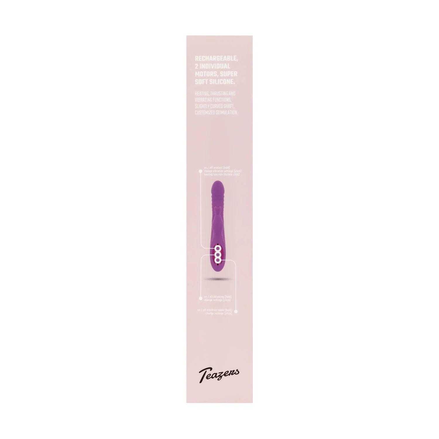 Ontdek de Teazers Stotende, Verwarmende Rabbit Vibrator in een stijlvolle paarse kleur, ontworpen voor vrouwen die op zoek zijn naar gerichte en veelzijdige stimulatie. Deze hoogwaardige vibrator combineert innovatieve technologie met gebruiksvriendelijkheid, waardoor hij zich uitstekend leent voor beginners én meer ervaren gebruikers die hun intimiteit willen verdiepen. De rabbit vibrator beschikt over twee krachtige, afzonderlijk te bedienen motoren: de hoofdas biedt 10 stootstanden en de flexibele rabbit-arm voorziet in 10 vibratiestanden die de clitoris precies weten te stimuleren. Hierdoor ervaar je een perfect afgestemde mix van vibratie en pulserende sensaties.