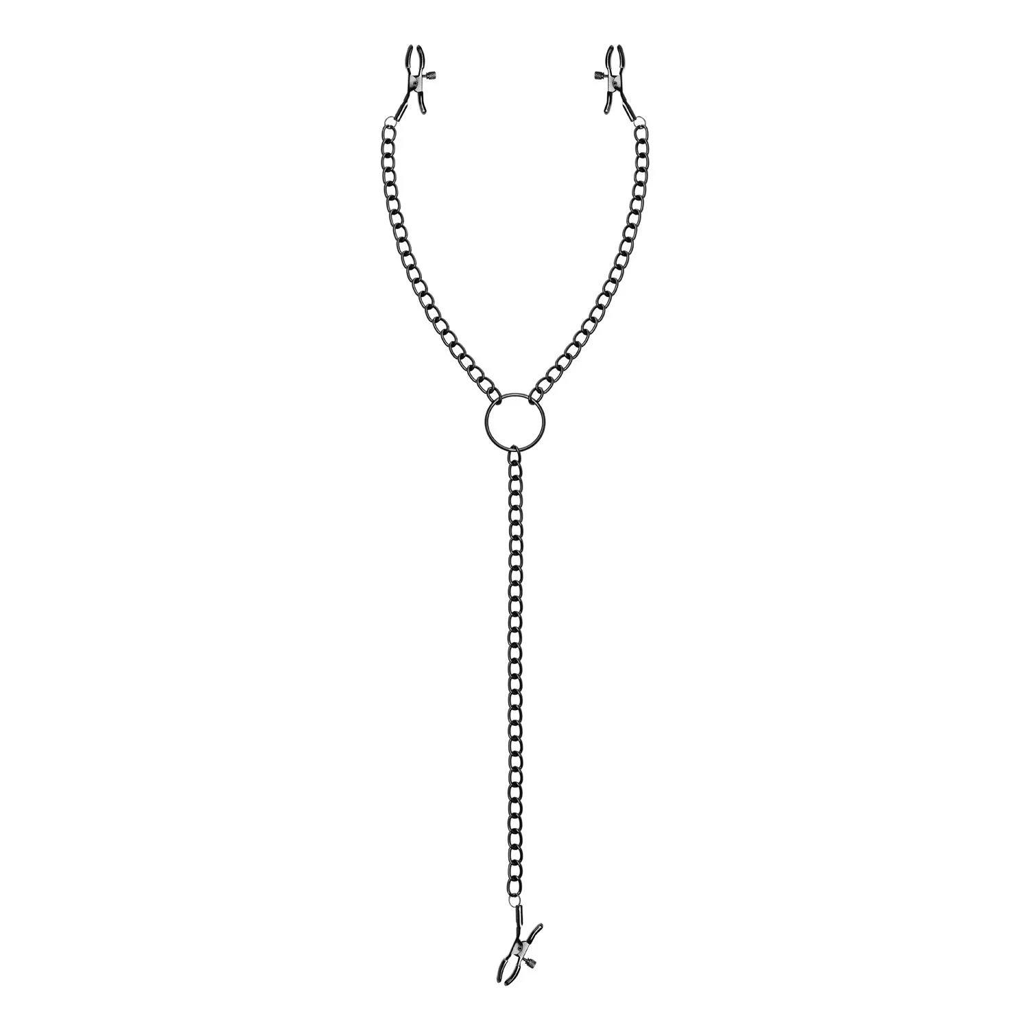 Ontdek de intense sensaties met de Tepel & Clitorisklemmen - Zwart van Bedroom Fantasies. Dit exclusieve intieme product is ontworpen voor vrouwen die op zoek zijn naar een spannende toevoeging aan hun erotische avonturen. Het setje bestaat uit tepelklemmen en een clitorisklem, verbonden in een stijlvolle bodyketting die een uitdagende uitstraling geeft. De zwarte kleur geeft het geheel een mysterieuze en verfijnde look, perfect passend in de wereld van BDSM en SM toys.