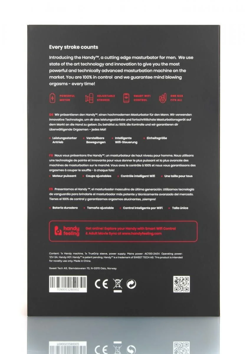 van de extreem flexibele sleeve kan worden aangepast voor een nog intenser gevoel. Bovendien is de Handy geschikt om te combineren met je eigen favoriete sleeves. De lengte en snelheid van de stoten zijn variabel en kunnen op het apparaat worden aangepast. Dankzij de krachtige motor kan de Handy tot 10 keer stoten per seconde en heeft hij een maximale lengte van 11 cm. Door de geïntegreerde dual core processor kan de Handy via een versleutelde WiFi verbinding met het internet worden verbonden. De lengte en snelheid van de stoten kunnen op deze manier overal ter wereld op afstand worden aangepast via de website handyfeeling.com. Je kunt jouw Handy synchroniseren met deze website, waarop ook video content te vinden is. De bewegingen van de masturbator worden dan aangepast aan de online video die je bekijkt. Het kan ook worden aangesloten op VR-headsets.