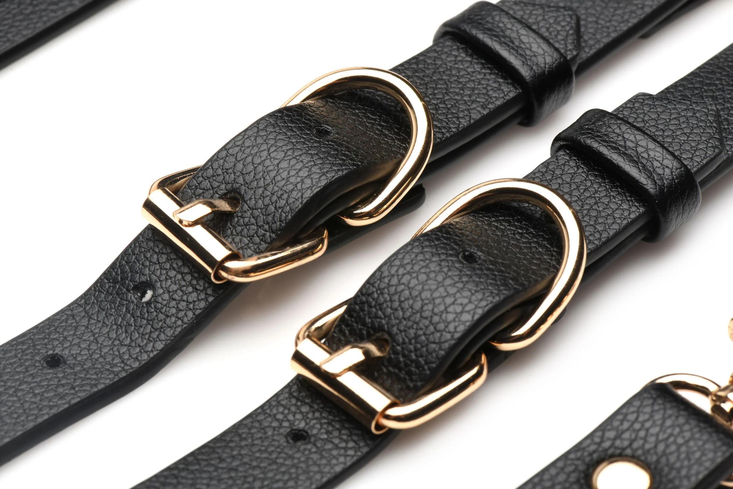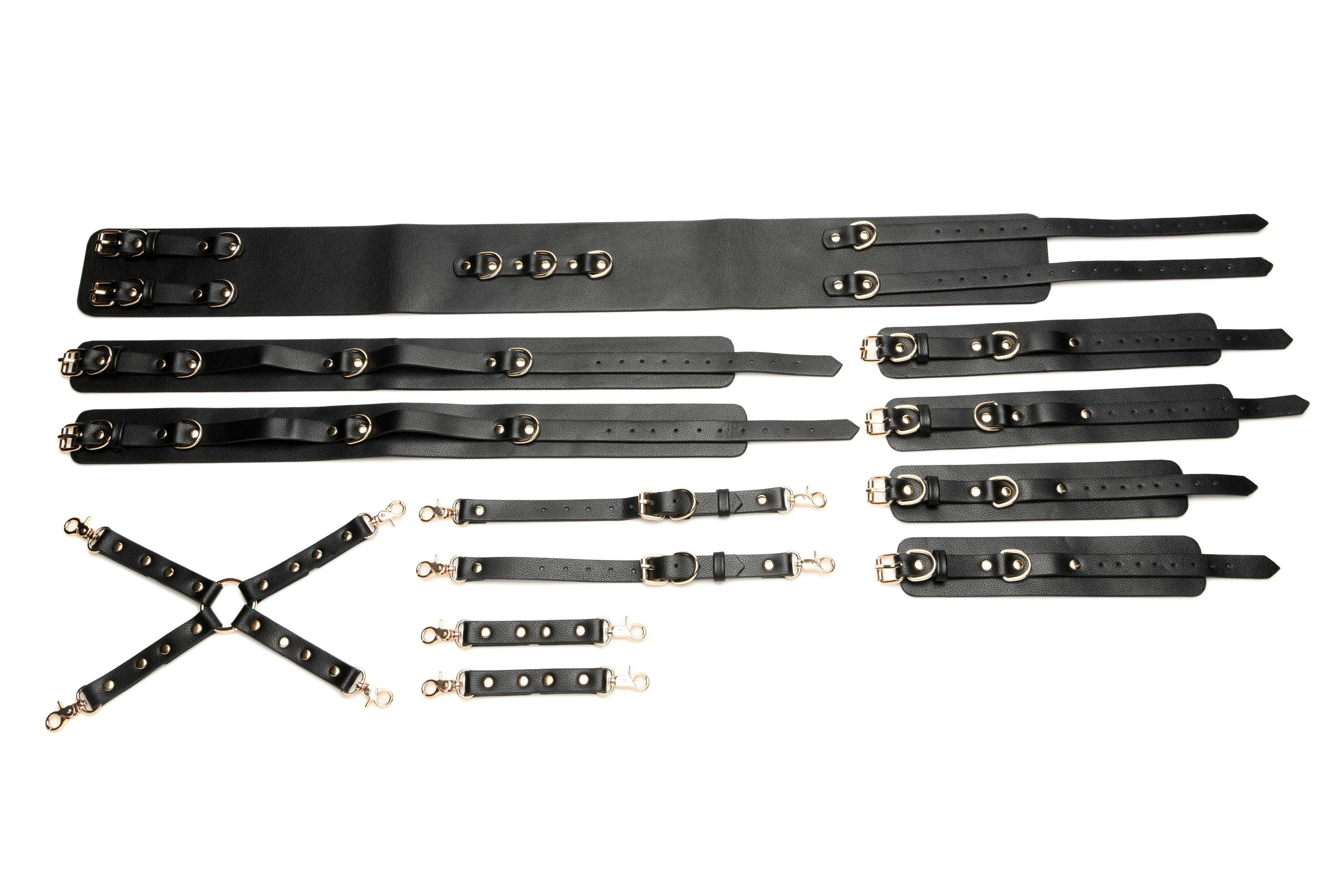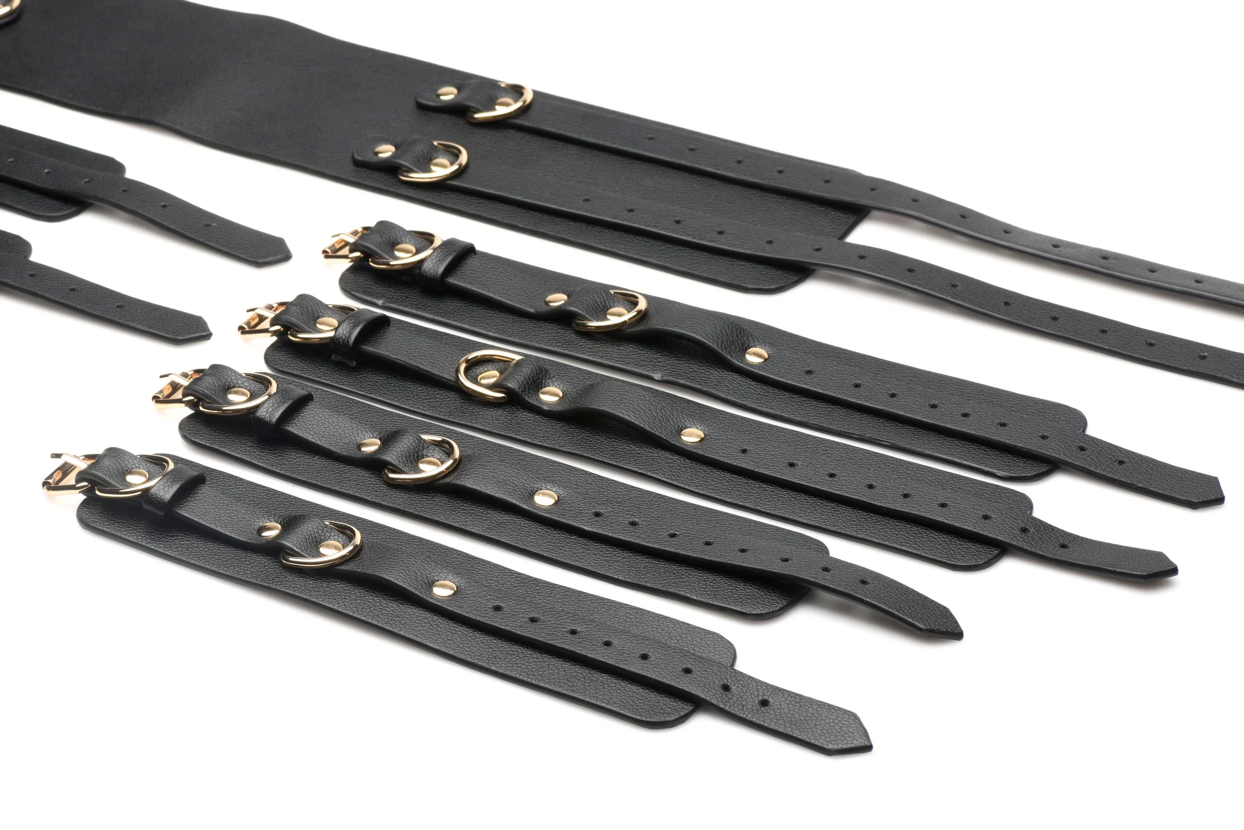 Deze set bevat alles wat jij en je partner nodig hebben om jou in allerlei ondeugende en kinky posities te plaatsen terwijl je vastgebonden bent. Elke van de riemen is volledig verstelbaar met de gespsluitingen. Deze zwarte, veganistische leren set ziet er goed uit en voelt geweldig aan. De set bevat 1 riem, 2 dijboeien, 2 polsboeien, 2 enkelboeien, 2 jarretels, 2 boei-connectors en 1 hogtie-connector. Het gouden metaal is nikkelvrij voor de gevoelige huid.
